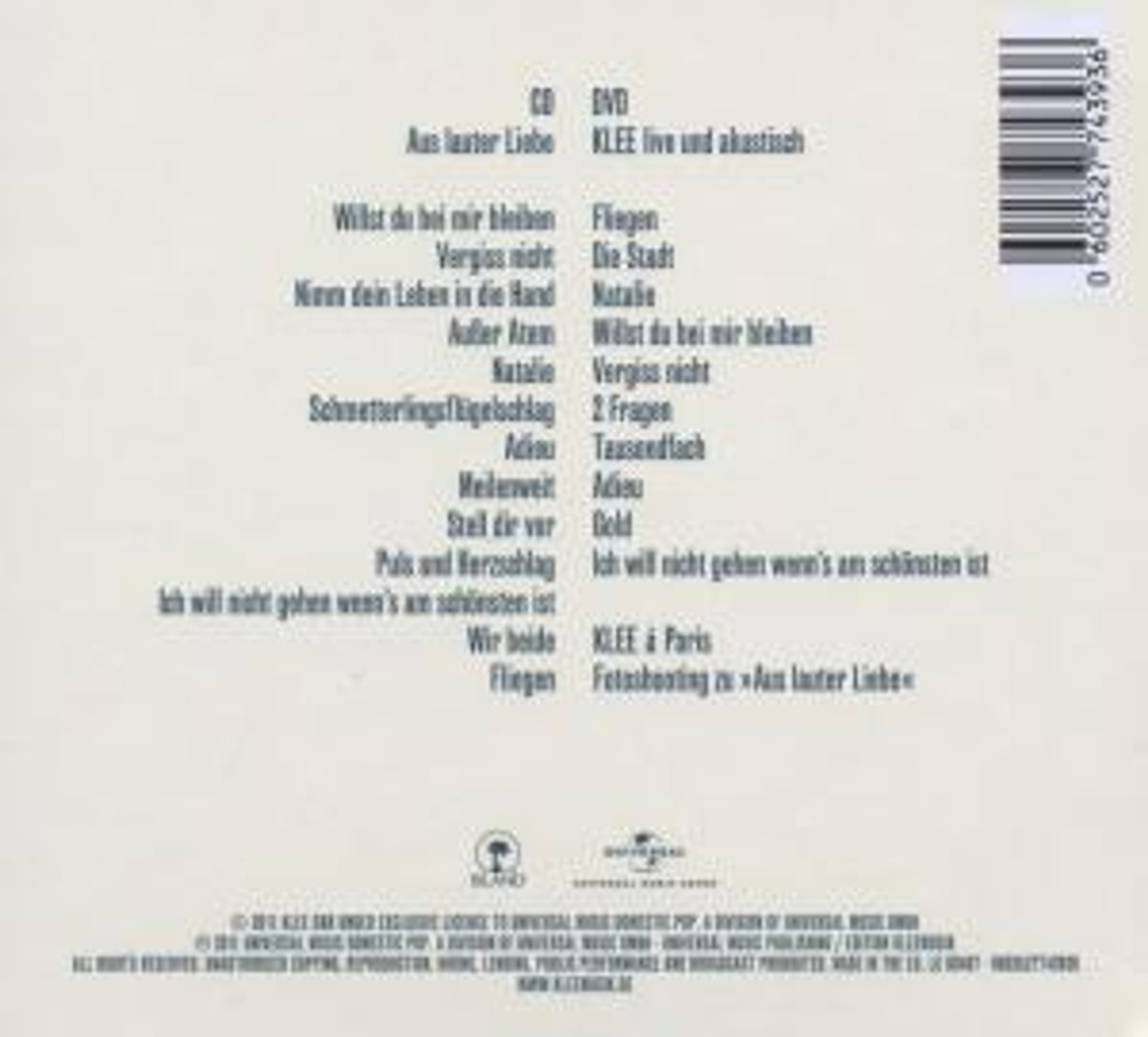 Leger und beschwingt, voller Lebenslust und durchwoben von tiefer Poesie und einer – bei aller offensichtlichen Leichtigkeit – milden Grundmelancholie, so bezaubern uns die in Paris entstandenen, romantischen Schwarz-Weiß-Fotografien, die dieses Album begleiten und seinen Titel illustrieren, wie es ähnlich treffend wohl nur den Bildern aus Filmen wie »Außer Atem« und »Jules & Jim« hätte gelingen können, die »Aus lauter Liebe« inspiriert haben, wie kaum etwas sonst. François Truffaut hat einmal gesagt: »Der Film von Morgen wird ein Akt der Liebe sein.« Ersetzt man in diesem Zitat den Begriff »Film« durch »Kunst«, dann erschließt sich der Albumtitel als programmatisches Statement im Geiste der Nouvelle Vague: »Aus lauter Liebe« atmet den gleichen Spirit, es erweckt die gleichen Sehnsüchte und beschwört die gleichen Ideale, die die Meisterwerke des französischen Films noch heute in uns wachrufen. Und es ist bezeichnend für KLEE, dass sie für ihr fünftes Album den Blick gen Frankreich richten und damit erneut über den Tellerrand hinausblicken: Sie haben ein gefeiertes Album in den USA veröffentlicht, Titel auf englisch, russisch und französisch aufgenommen, Konzerte rund um den Erdball gespielt und überall die Herzen im Sturm erobert.