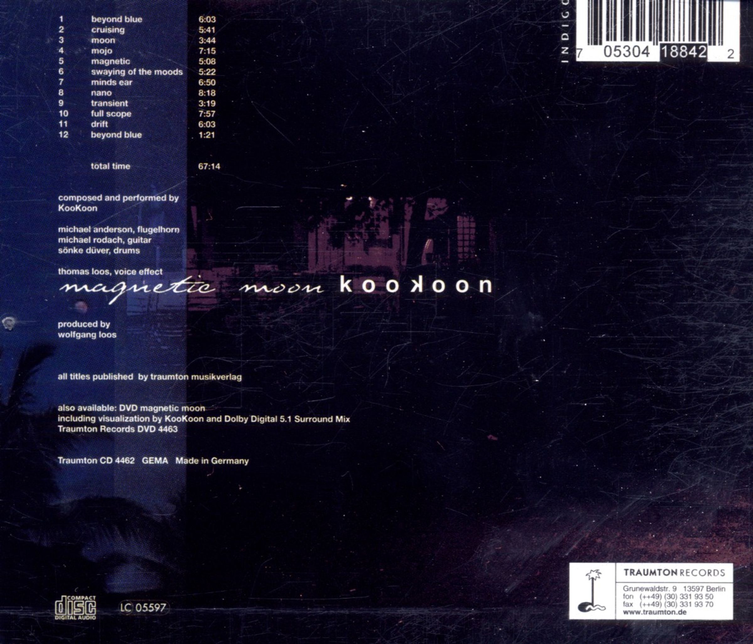 Der Mond - Symbol für das Unbewußte und Verborgende, das Unergründliche, Phantasie und Emotion - Zwölf Stücke lang durchwandert "Magnetic Moon" wunderschöne Stimmungstäler, um dann wieder zum Ausgangspunkt zurückzukehren: "Beyond Blue". Von geheimnisvoller Melancholie umwoben, beginnt eine Hammondorgel ihren wehmütigen Dialog mit Piano und Flügelhorn. Tastet sich vorsichtig durch unterschiedlichste Empfindungen, die sich zu einem Schleier verweben. Zwei Jahre hat KooKoon an "Magnetic Moon" gearbeitet und erstmals nicht ausschließlich auf die Kraft seiner einzigartigen Klangbilder gesetzt. Konzipiert als DVD, nähert sich KooKoon nun auch in optischen Bildern jenen Elementen, die ihn beschäftigen und faszinieren: Wasser, Wellen und Licht. Ambient Videospheres, traumverlorene Momentaufnahmen in denen die Zeit stillzustehen scheint. Flammende Horizonte, Unterwasserwelten, Impressionen der nächtlichen Hauptstadt - wenig bleibt eindimensional. KooKoon behandelt seine Bilder als wären sie Klänge: Er schichtet sie übereinander, bis sich Bildebenen überlagern, wiederholen und in anderen Farben und "Texturen " zu schimmern beginnen. Dabei entstehen irritierende, fesselnde Collagen.