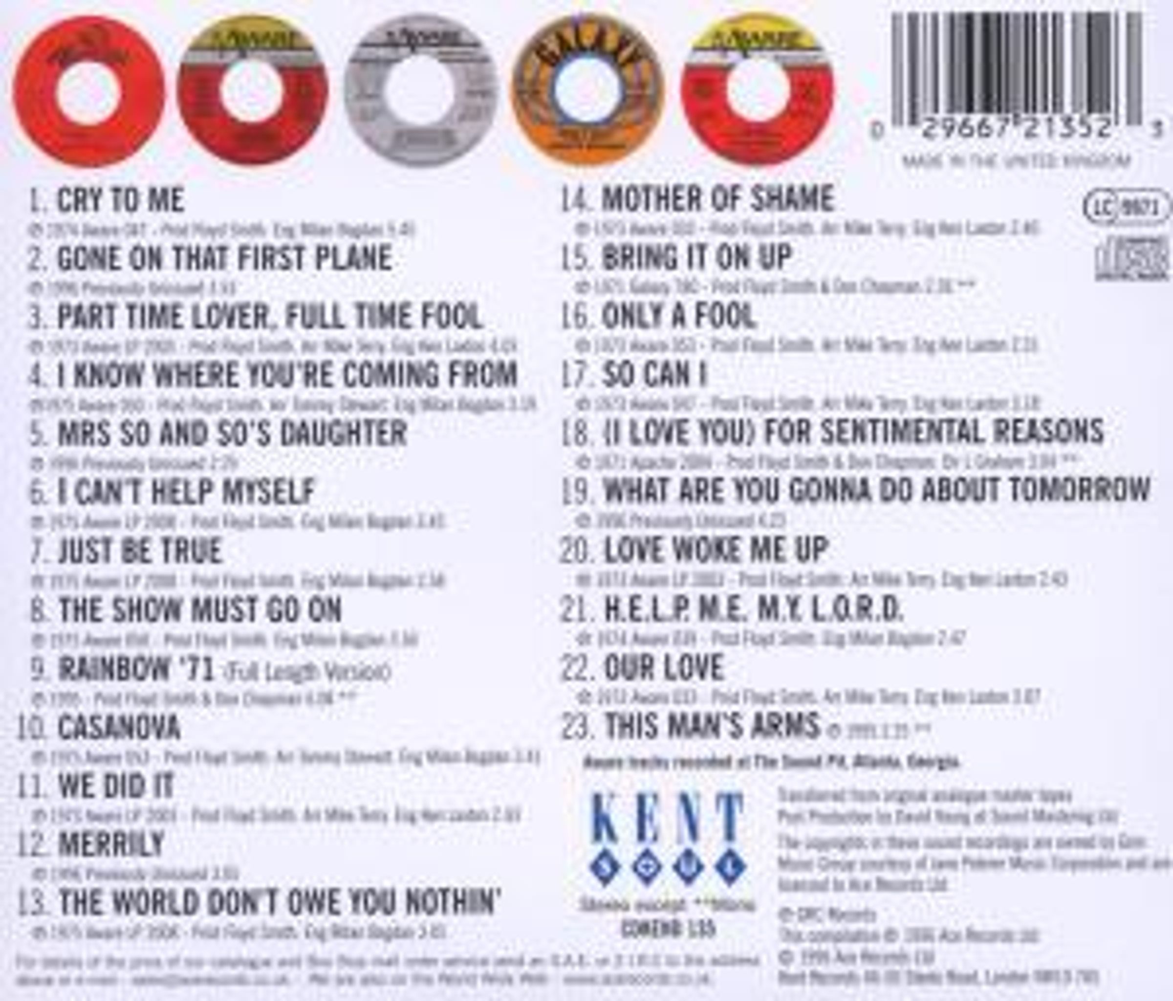 The Soul Book (the influential book by Clive Anderson, Ian Hoare et al-.-Methuen, 1975) said of her "there is no shortage of singers waiting in the wings, artists like Loleatta Holloway who have been making ripples in the business for some years. Numbers like her impassioned Cry To Me...continue to knock insistently at the door". By the late 1970s, the door to fame had opened for Loleatta and she went on to become one of the great disco divas of the era. The sides she cut for Aware between 1971 and 1975, however, (including 1974's Cry To Me) stand alongside the very finest soul music ever made. Born in Chicago in 1946, Loleatta started out as a gospel singer, moving to secular music in 1971 with Rainbow '71 b / w For Sentimental Reasons (Apache) which was picked up nationally by Galaxy Records (who swapped the B-side for Bring It On Up). That early A-side (a Curtis Mayfield-penned number), the two differing B-sides and twenty of the brilliant sides she made for Aware Records (including the afore-mentioned Cry To Me) are brought together in this definitive collection of Loleatta's Hotlanta Soul. Powerful deep soul ballads, finger-snappers and the odd funky offering set the mood while the skills of such great songwriters as Sam Dees, Curtis Mayfield, Ashford & Simpson and Loleatta herself ensure that the songs are always more than just convenient hooks for her stunning vocals.