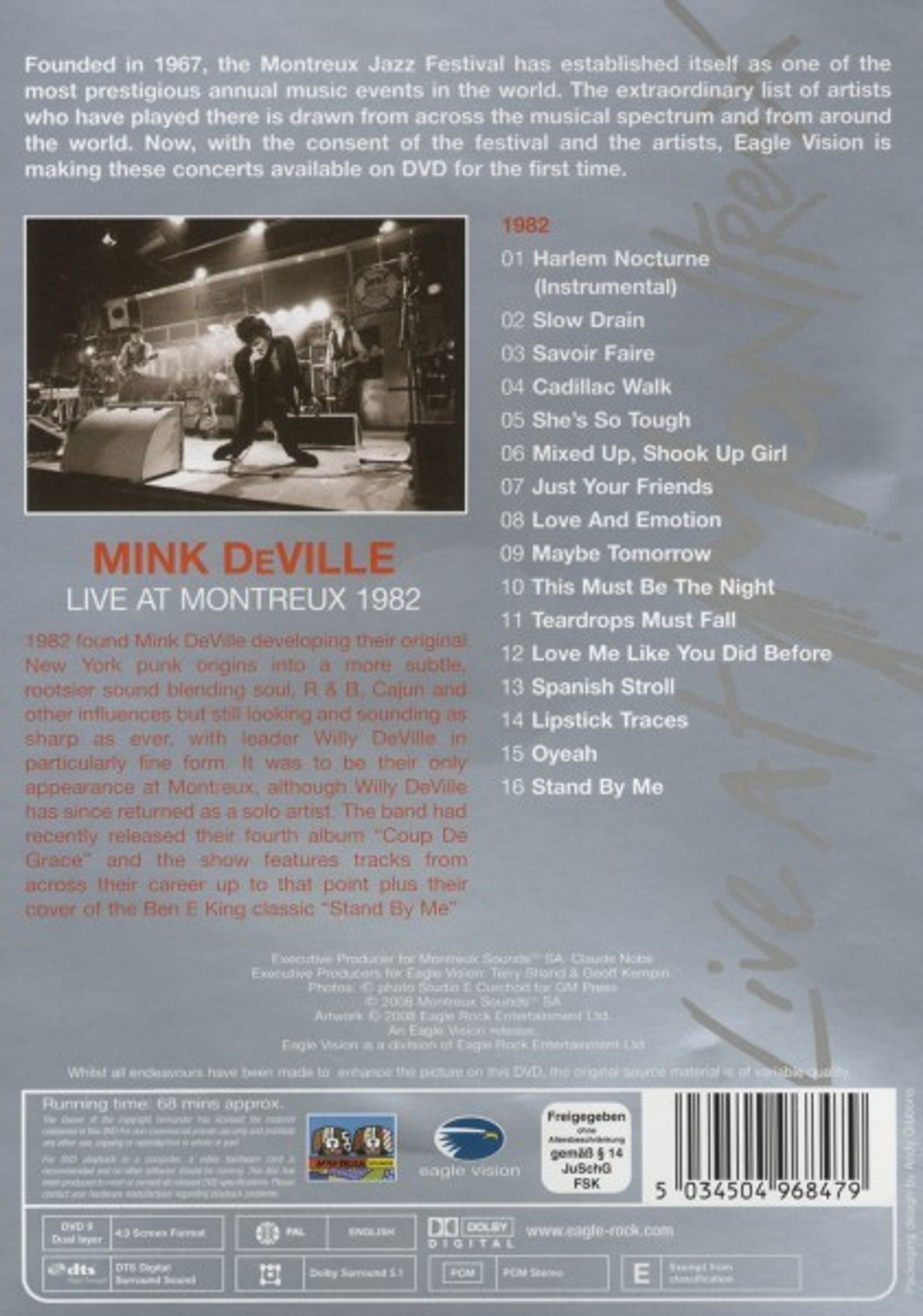 1982 trat Mink DeVille – die Band hinter dem charmanten Frontmann Willy DeVille – auf dem renommierten Montreux Jazz Festival auf. »Live At Montreux 1982« zeigt eine inspirierende Show: Willy DeVille vor einer bewundernden Menge, gekonnt unterstützt von seiner Band, brachte er spanisches Temperament und viel amerikanische Popkultur auf die Bühne. Dieses schweißgetränkte 16-Song-Set, in High Definition aufgenommen, kommt in einer CD- und DVD-Edition und enthält DeVille-Klassiker wie »Spanish Stroll«, »Savoir Faire« und »Mixed Up, Shook Up Girl« sowie ihr Cover des Ben E. King All-Time-Hits »Stand By Me« – ein echtes Muss für jeden DeVille-Fan.