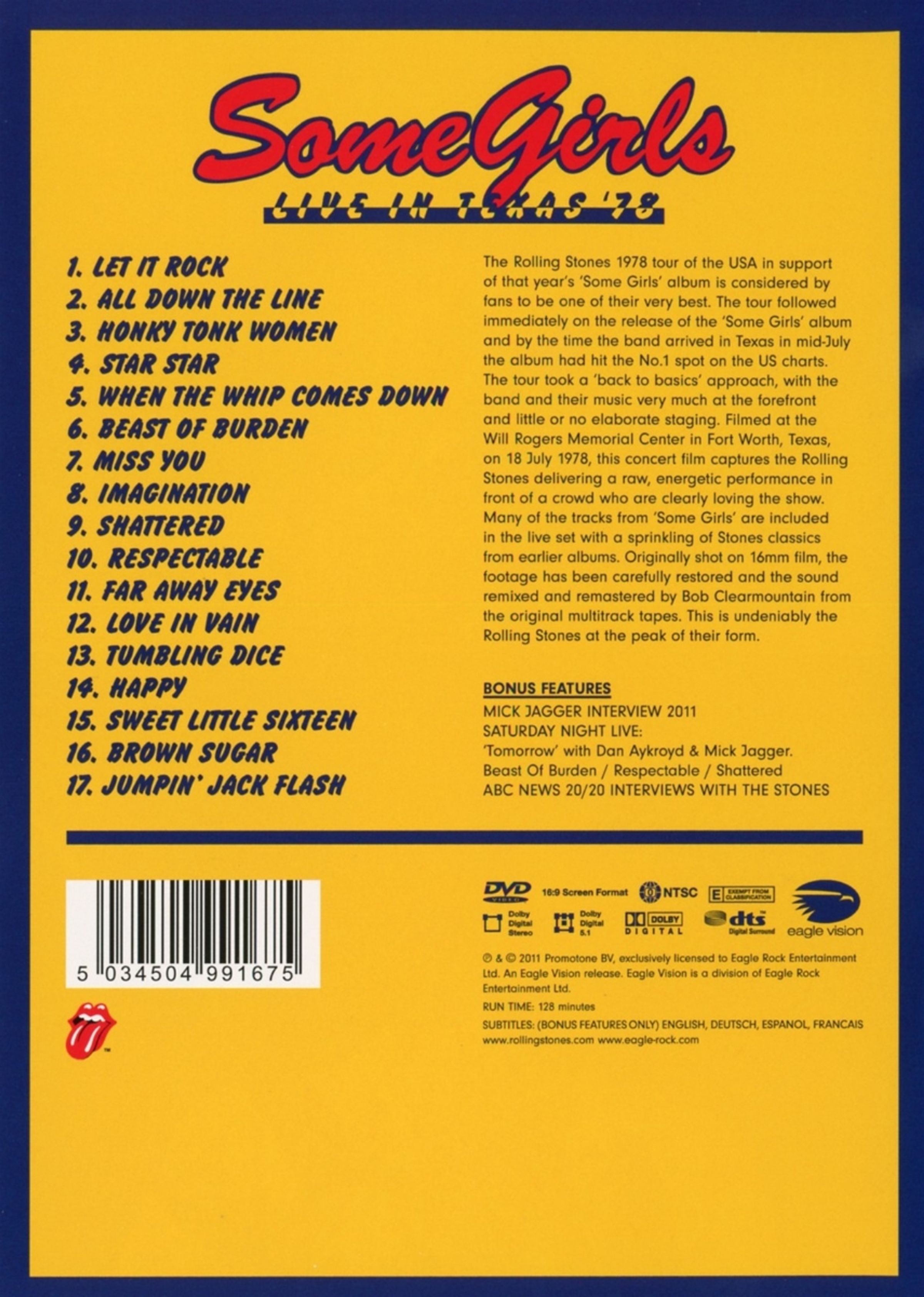 The Rolling Stones 1978 tour of the USA in support of that year’s “Some Girls” album is considered by fans to be one of their very best. The tour followed immediately on the release of the “Some Girls” album and by the time the band arrived in Texas in mid-July the album had hit the No. 1 spot on the US charts. The tour took a “back to basics” approach, with the band and their music very much at the forefront and little or no elaborate staging. Filmed at the Will Rogers Memorial Center in Fort Worth, Texas, on 18 July 1978, this concert is typical of the tour with the Rolling Stones delivering a raw, energetic performance in front of a crowd who are clearly loving the show. Many of the tracks from “Some Girls” are included in the live set with a sprinkling of Stones classics from earlier albums. Originally shot on 16mm film, the footage has been carefully restored and the sound remixed and remastered by Bob Clearmountain from the original multitrack tapes.