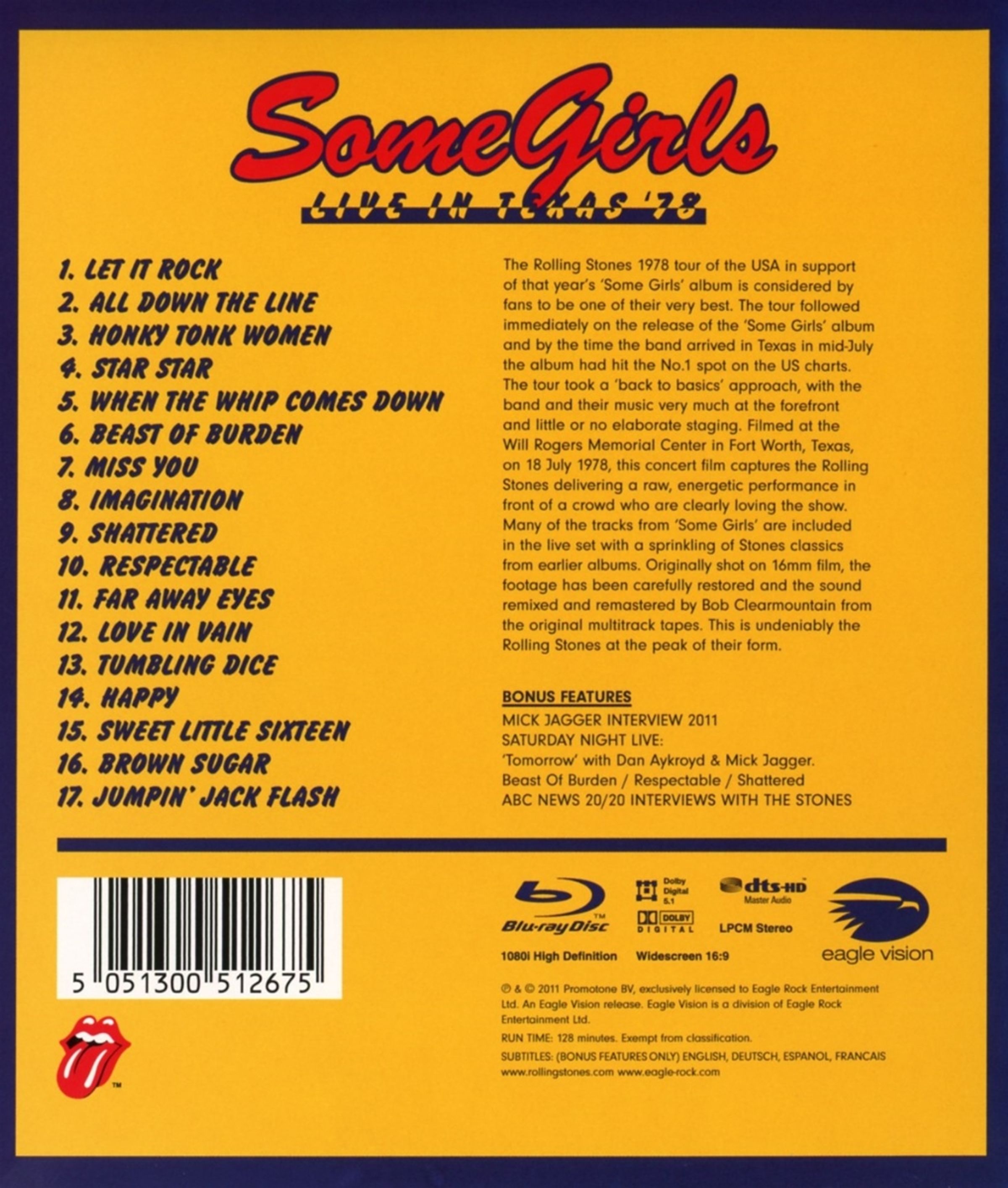 The Rolling Stones 1978 tour of the USA in support of that year’s “Some Girls” album is considered by fans to be one of their very best. The tour followed immediately on the release of the “Some Girls” album and by the time the band arrived in Texas in mid-July the album had hit the No. 1 spot on the US charts. The tour took a “back to basics” approach, with the band and their music very much at the forefront and little or no elaborate staging. Filmed at the Will Rogers Memorial Center in Fort Worth, Texas, on 18 July 1978, this concert is typical of the tour with the Rolling Stones delivering a raw, energetic performance in front of a crowd who are clearly loving the show. Many of the tracks from “Some Girls” are included in the live set with a sprinkling of Stones classics from earlier albums. Originally shot on 16mm film, the footage has been carefully restored and the sound remixed and remastered by Bob Clearmountain from the original multitrack tapes.