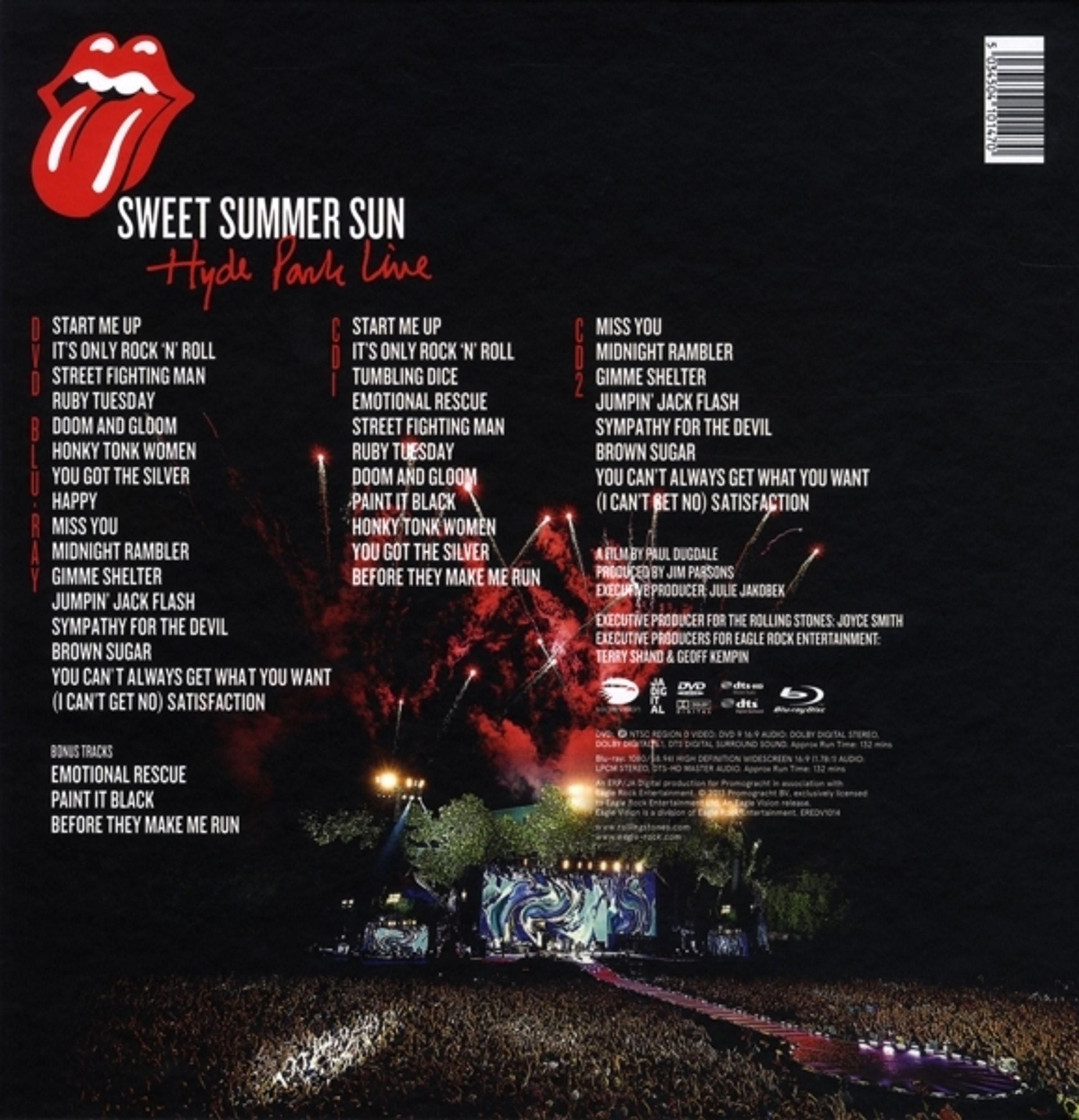 Mit dem neuen Album "Sweet Summer Sun – Hyde Park Live" erhalten neue als auch alte Fans die Möglichkeit, ihre Idole in aktueller Besetzung live zu erleben. Das Hyde-Park-Konzert der Rolling Stones erscheint in umfangreichen Editionen auf DVD und Blu-ray. Die CD- und Vinylversion enthält jeweils die DVD als Zugabe. Zusätzlich erscheint eine Limited Deluxe Edition inkl. Buch als auch eine Limited T-Shirt-Edition.