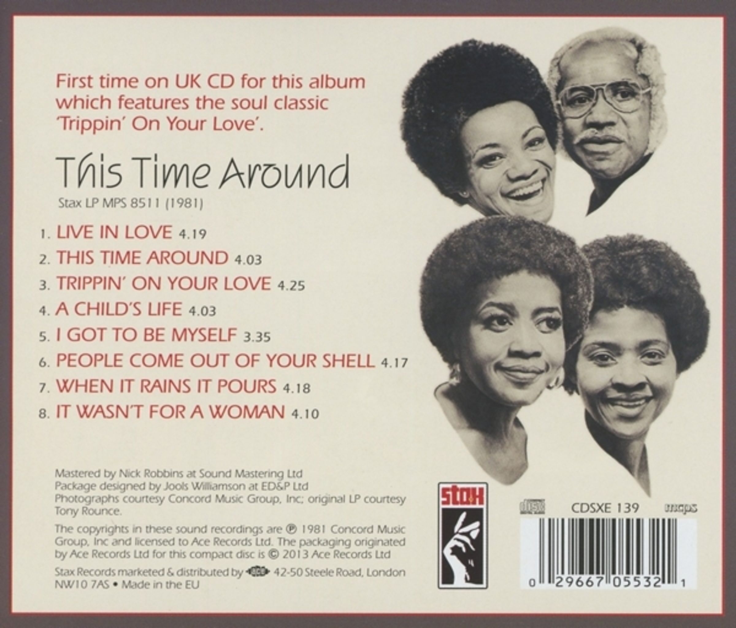 1968 unterschrieb die Formation bei Stax Records, und die erfolgreichste Phase begann. Die ersten beiden Alben wurden von Steve Cropper produziert, und Booker T. & the MG.‘s agierten als Begleitband. Insgesamt hatten die Staple Singers 12 Hits bei Stax, darunter ‘Heavy Makes You Happy (Sha-Na-Boom Boom)‘ und ‘I‘ll Take You There‘, das Platz 1 der Singlecharts erreichte. Nachdem Stax in finanzielle Schwierigkeiten geriet, nahm Curtis Mayfield die Band zu seinem Label Curtom Records, wo sie den Number-1-Hit ‘Let‘s Do It Again‘ hatte. Vorher erschien aber noch das 1981er Album ‘This Time Around‘, welches bis dato unveröffentlichtes Material aus der 1970er Dekade enthielt und nun als CD wiederveröffentlicht wird. Der Dancefloor-Klassiker ‘Tripping On Your Love‘ ist hier u. a. auch enthalten.