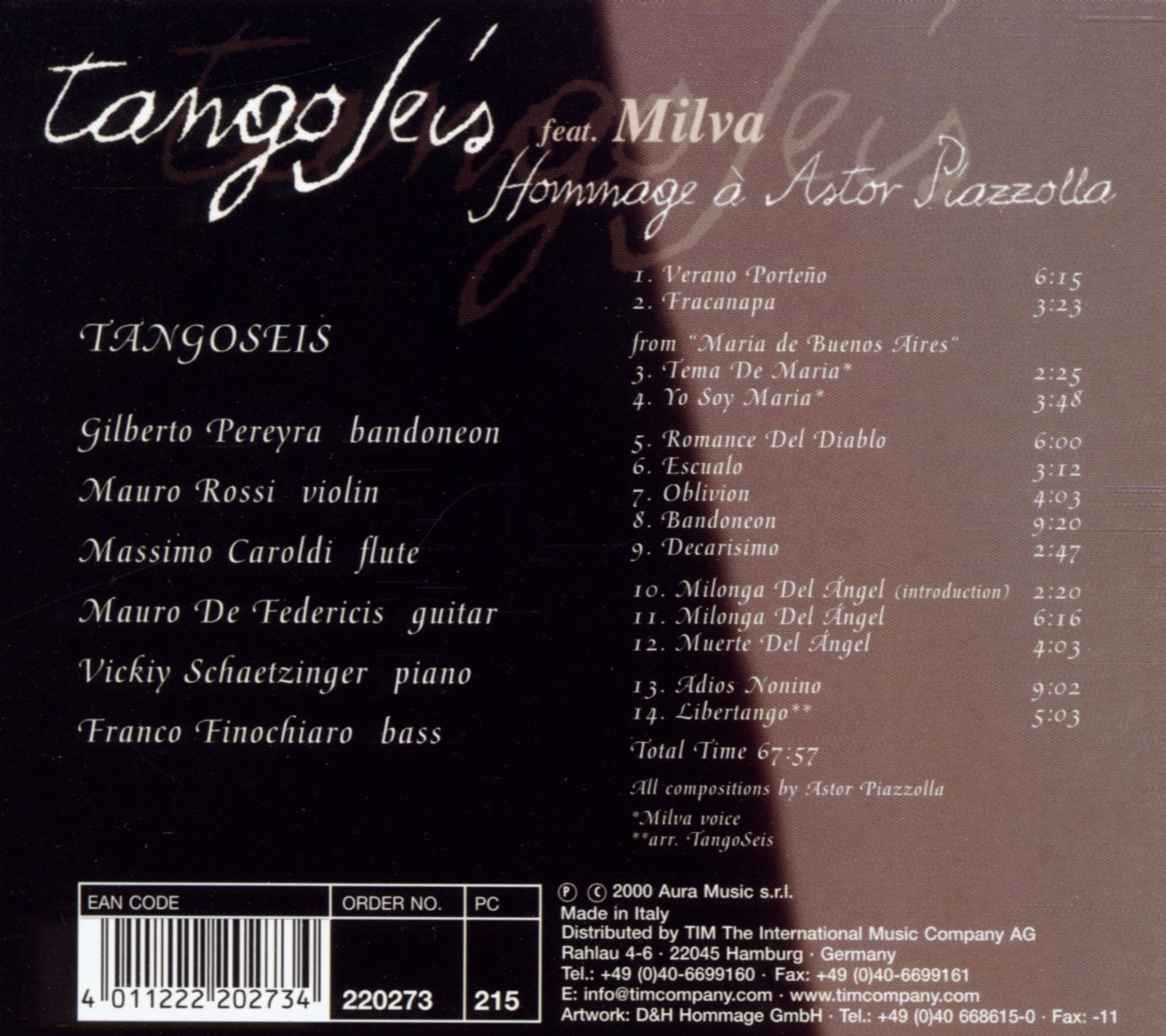 Tango Seis wurde 1995 mit der Idee gegründet, die Musik von Astor Piazzolla zu spielen. Seit 1998 trat die energievolle Sängerin Milva (Piazzollas bevorzugte Sängerin, der er viele Kompositionen widmete) mit Tango Seis auf der ganzen Welt auf. Diese CD ist ein Hörerlebnis für jeden Liebhaber des Tango Nuevo!