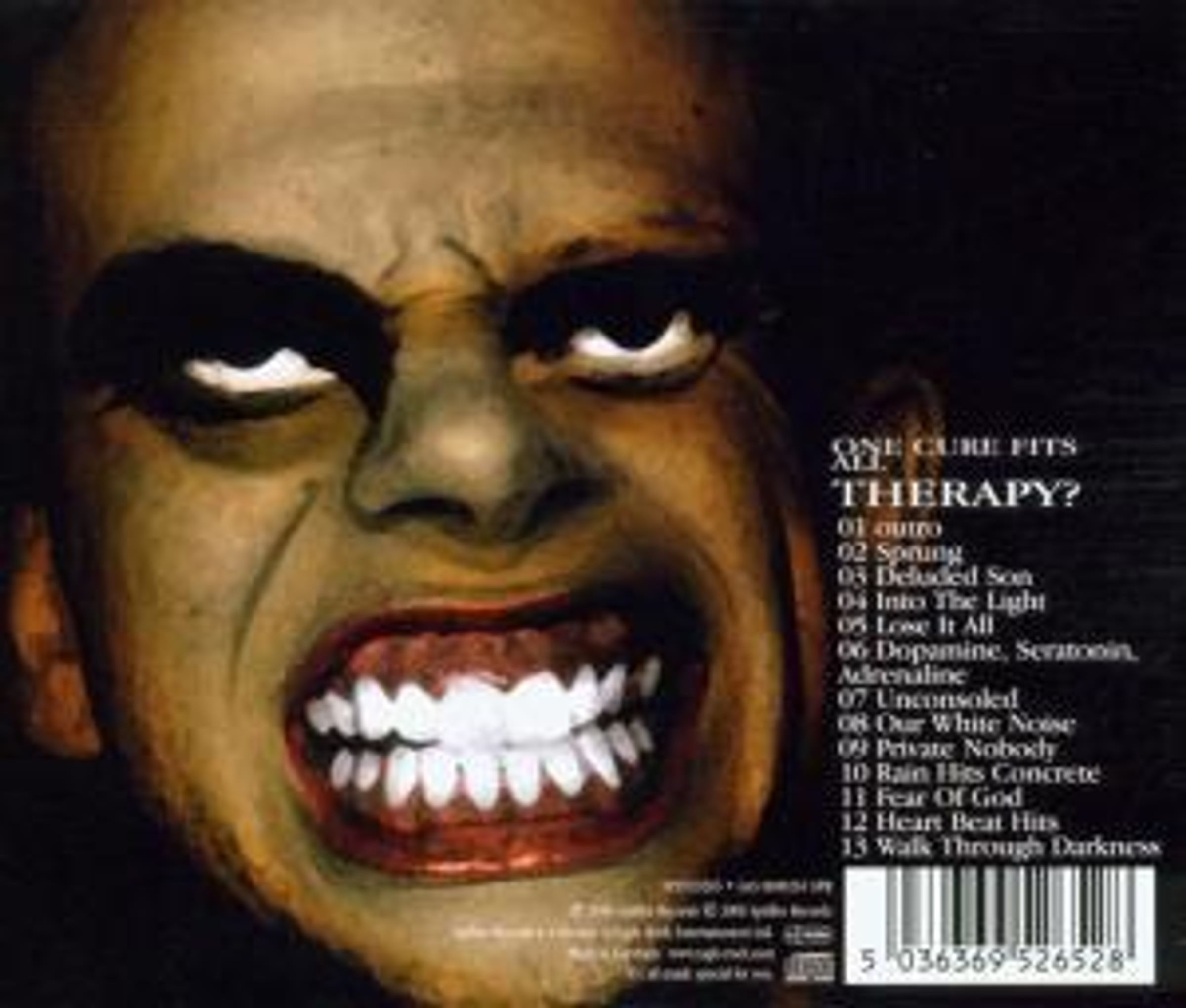 Mit One Cure Fits All setzen Cairns & Co. nun ein dickes Ausrufezeichen hinter die aufsteigende Tendenz der letzten Jahre. Da ist alles drin, wofür man Therapy? nun schon so lange mag, wie dieses Land wiedervereinigt ist: störrische Leidenschaft ("Into The Light") und tiefe Melancholie ("Unconsoled"), treibende Rhythmik ("Sprung", "Deluded Son"), trockene Riff-Rock-Hymnen ("Our White Noise", "Walk Through Darkness") und ihre simplen Markenzeichen-Melodien ("Dopamin, Seratonin, Adrenaline"). Und wenn sie bei "Lose It All" oder "Heartbreak Hits" dann mal eben abgehen wie Primus zu ihren besten Zeiten, ist endgültig klar, dass mit dieser unverwüstlichen Band noch lange zu rechnen ist. -- Dirk Siepe