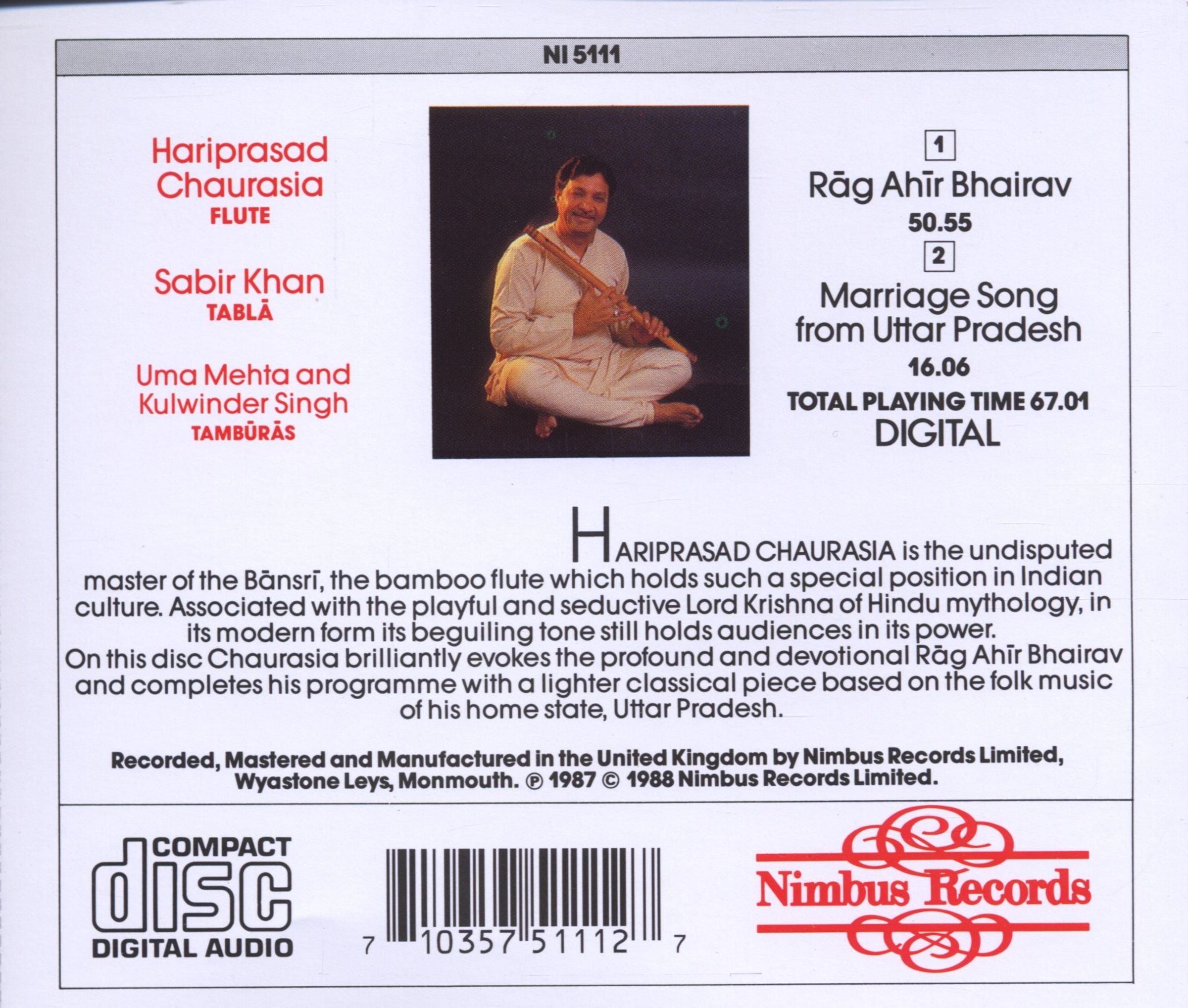 Hariprasad Chaurasia ist der unangefochtene Meister der Bansri, der Bambusflöte, die in der indischen Kultur eine besondere Stellung einnimmt. Sie wird mit dem verspielten und verführerischen Gott Krishna der hinduistischen Mythologie in Verbindung gebracht, und auch in ihrer modernen Form fasziniert ihr betörender Klang das Publikum. Auf dieser CD beschwört Chaurasia auf brillante Weise den tiefgründigen und hingebungsvollen Rag Ahir Bhairav herauf und rundet sein Programm mit einem leichteren klassischen Stück ab, das auf der Volksmusik seines Heimatstaates Uttar Pradesh basiert.