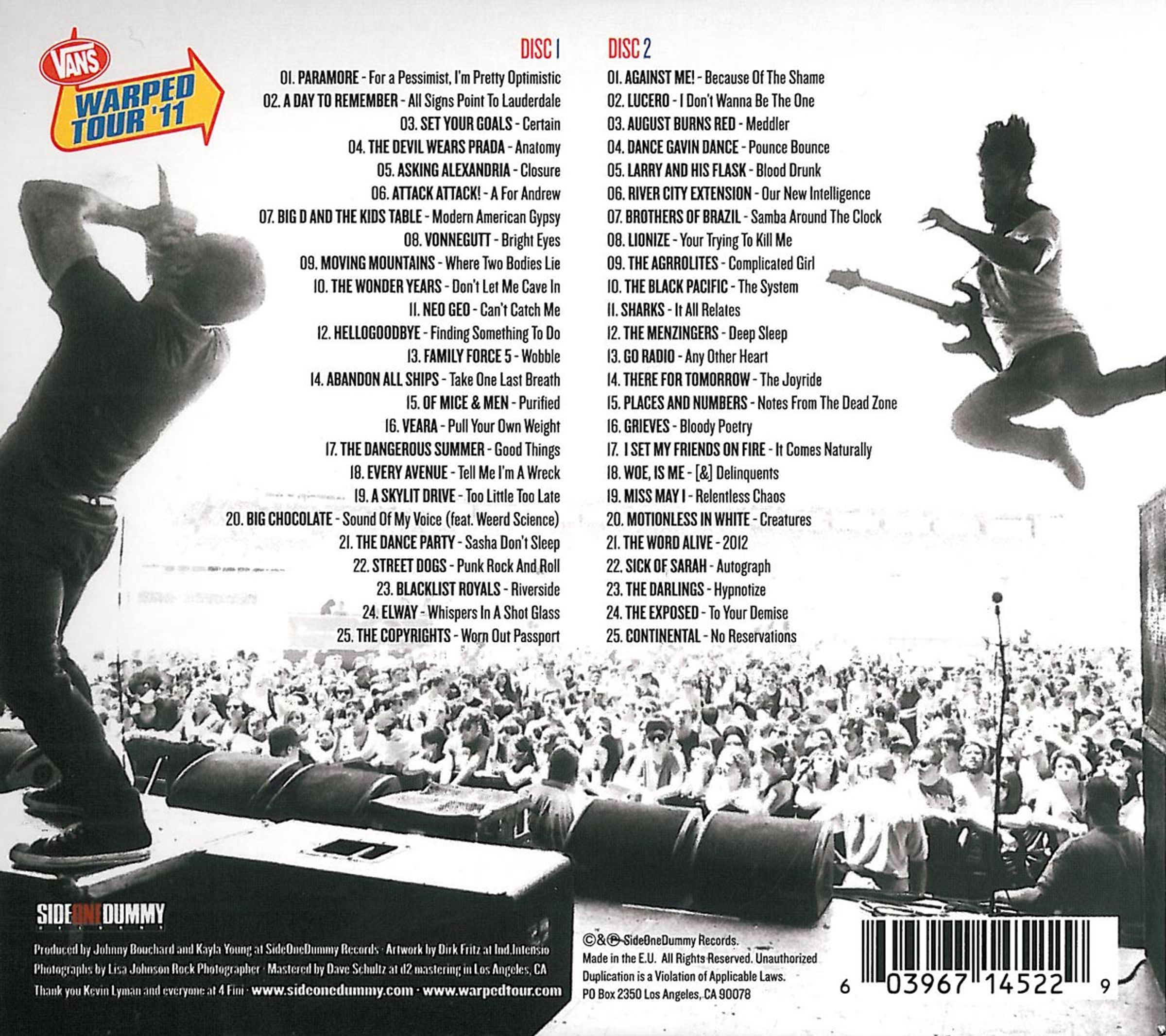 50 Songs machen die 2011 Vans Warped Tour Compilation zu einem Schnäppchen-Pflichtkauf für SammlerInnen und Szenekenner. Mit Paramore, A Day To Remember, Attack! Attack!, The Devil Wears Prada, Dance Gavin Dance, Hellogoodbye, Veara, Against Me!, August Burns Red, Sharks, I Set My Friends On Fire, Street Dogs, The Black Pacific, Woe Is Me, Miss May I, Abandon All Ships, Asking Alexandria, The Wonder Years, Set Your Goals, River City Extension, Big D & The Kids Table, The Aggroutes, The Menzingers, Go Radio, The Dangerous Summer, The Word Alive und vielen anderen.