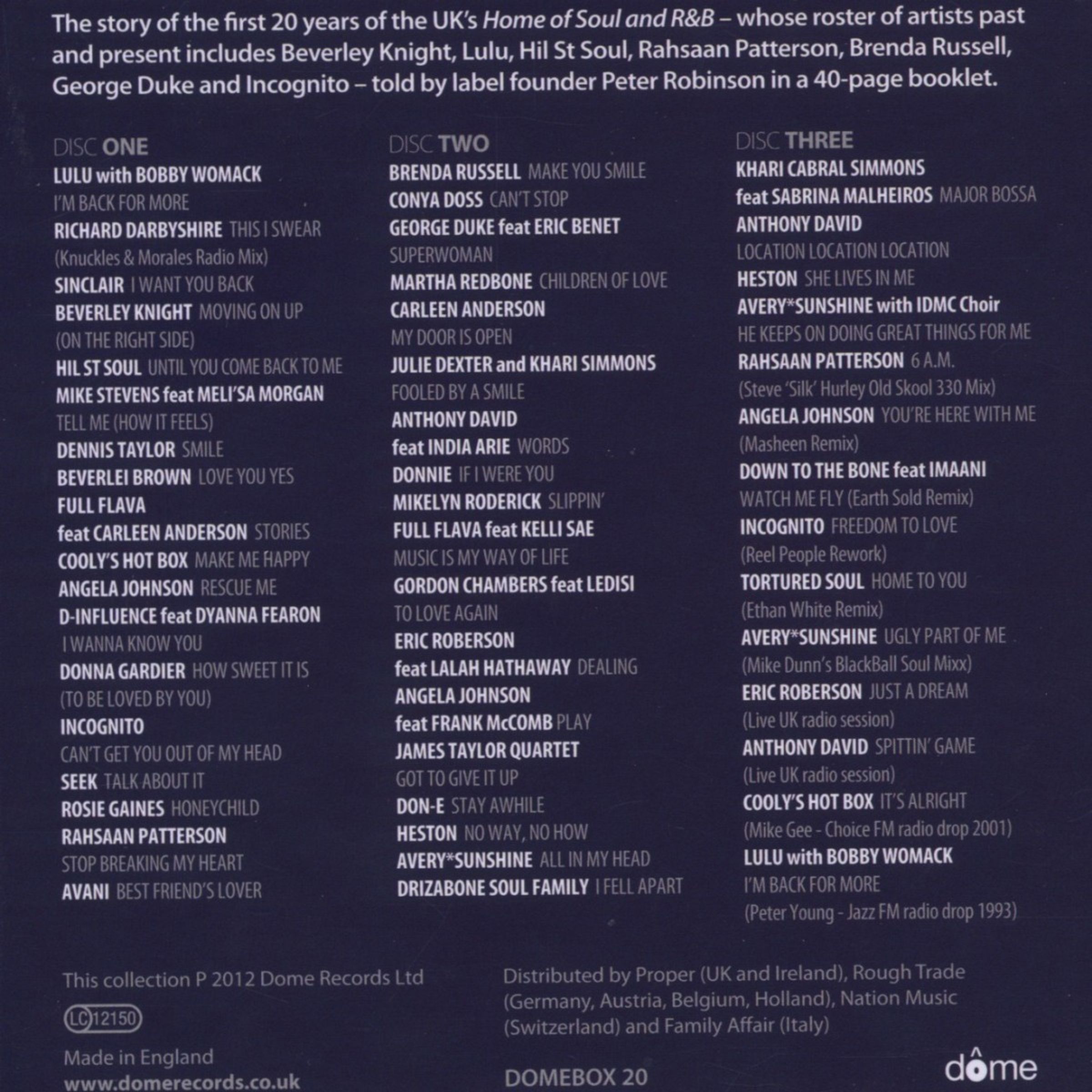 Zum runden Geburtstag gibt es jetzt ein umfangreiches Box Set inklusive 40-seitigem Booklet mit ausführlichen Liner Notes vom Labelgründer Peter Robinson und vielen bis dato unveröffentlichten Bildern der Dome Acts. CD1 und CD2 beinhalten die besten Songs aus 20 Jahren Labelgeschichte, auf der dritten CD befinden sich ausnahmslos neue und unveröffentlichte Tracks! Für Soul-Fans ein Highlight!
