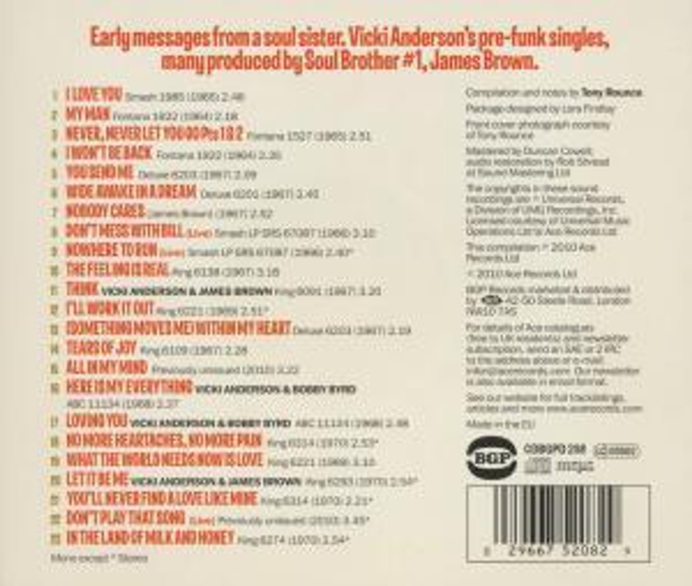 The earliest two tracks, recorded in her home state of Texas in 1964, were produced by Walter Whisenhunt and reputedly first released on his local Whiz label. (If you’ve ever seen a copy you must be a keen-eyed hunter.) The 45 resurfaced on US Fontana after Vicki joined Brown’s revue. Two 1968 tracks were recorded by Bobby & Vicki in NYC for ABC during a breakaway from the revue. All other tracks, a couple of them previously unissued, were recorded under the James Brown Productions umbrella, although whether JB had much to do with some of them is debatable. Band members Bud Hobgood and Dave Matthews often fulfilled those duties while the boss was otherwise engaged.