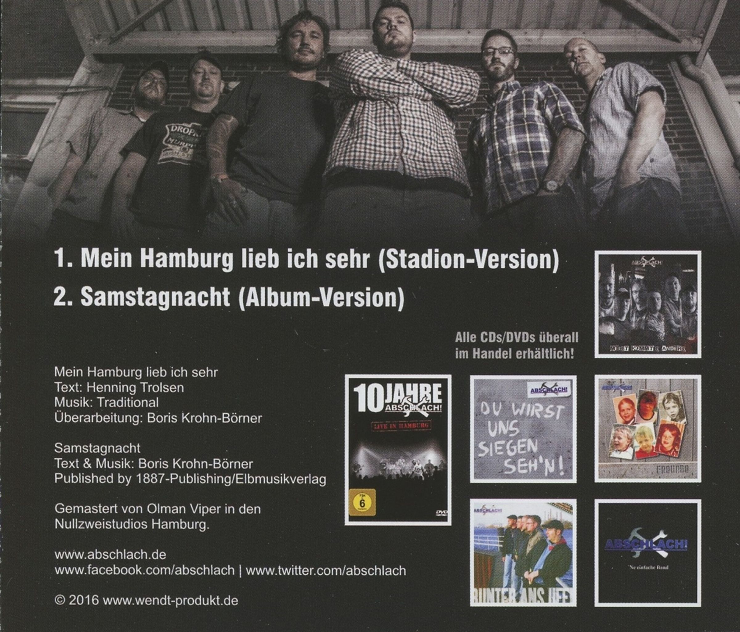 Abschlach! haben den Song inzwischen sogar live im Innenraum des Stadions performt, zudem ein Video dieses Auftritts im Internet veröffentlicht. Als Bonus-Song ist die zweite Single-Auskopplung des aktuellen Albums enthalten. Mit »Samstagnacht« steht eine weitere, neue Ballade über Hamburg, den Hafen und das Meer in den Startlöchern, welche durchaus das Zeug hat in die Fußstapfen von Abschlach!s Stadionhymne zu treten. Ein Video zu diesem Song ist ebenfalls im Internet zu sehen.