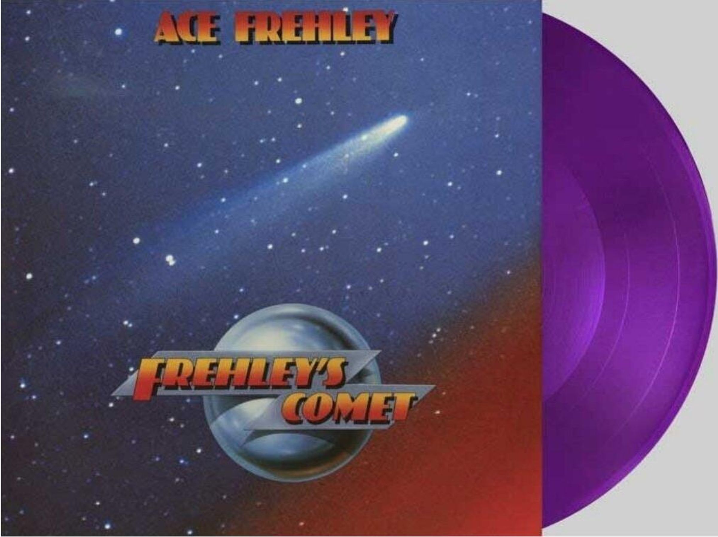 Text: "ACE FREHLEY", "FREHLEY'S COMET". Illustration eines Kometen im Weltraum mit violetter Vinyl-Schallplatte., LP