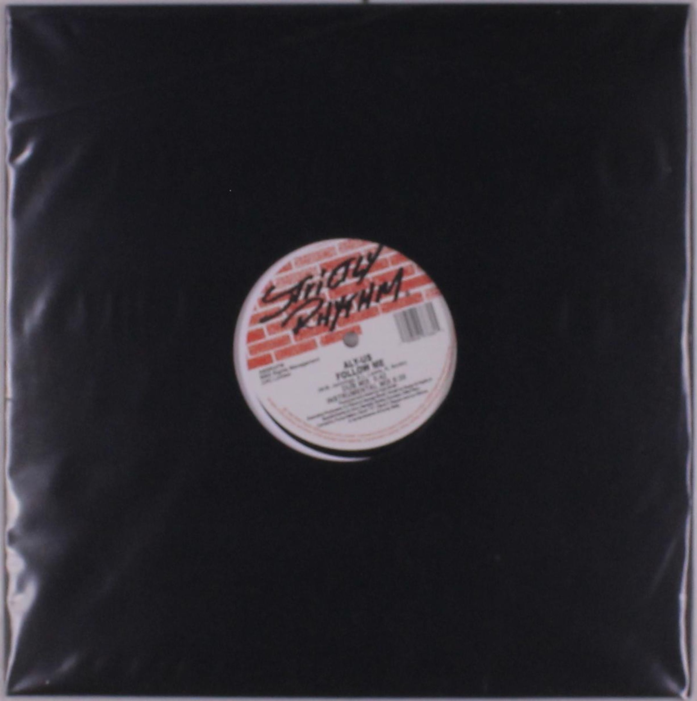 "Strictly Rhythm, Aly-Us, Follow Me" auf einer Plattenhülle; schwarze Vinylhülle mit zentralem Etikett in Rot und Weiß., Single 12"