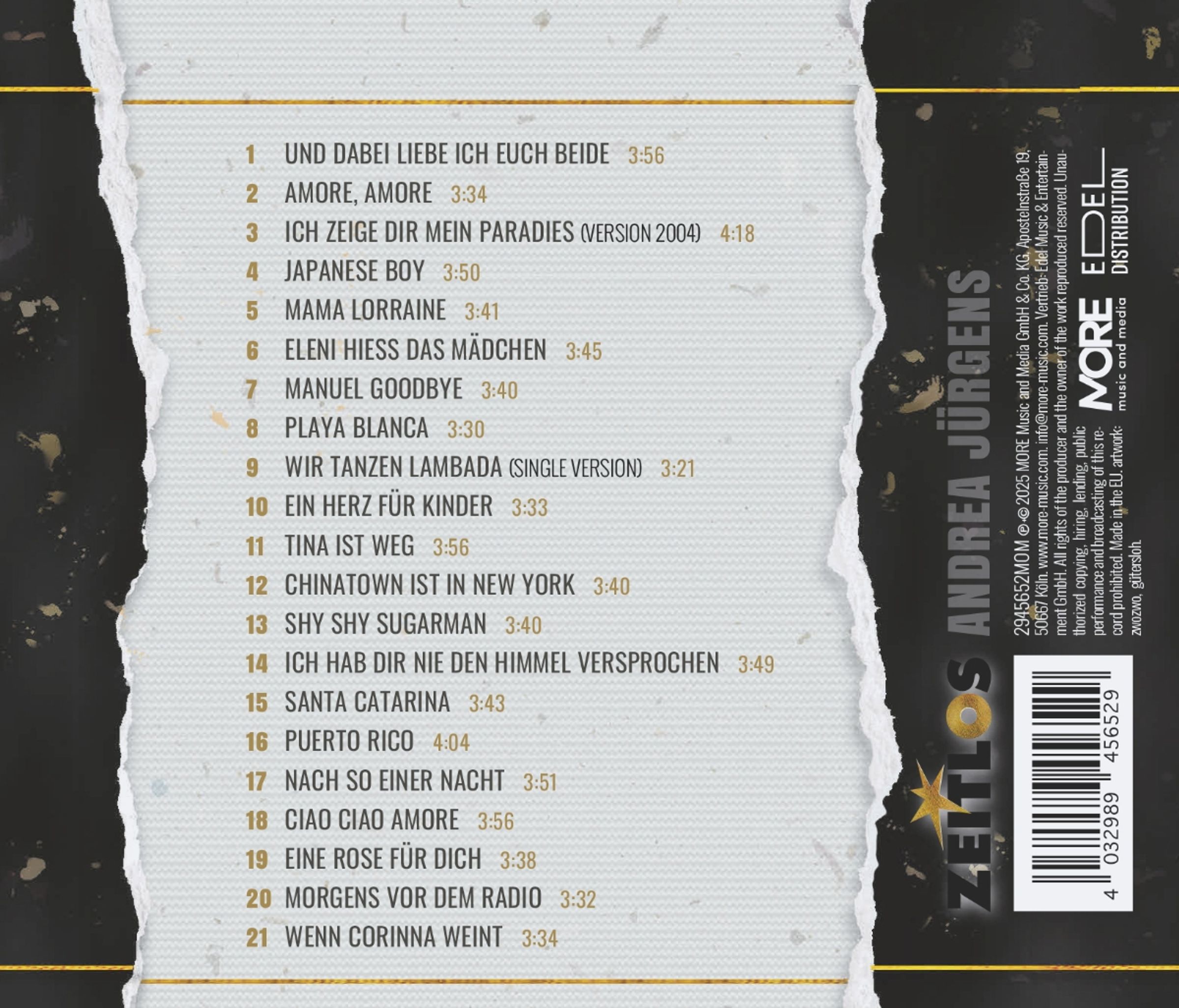 Die CD »Zeitlos« präsentiert auch Hits wie »Mama Lorraine«, eine herzliche Hommage, »Ich hab dir nie den Himmel versprochen« – ein emotionaler Klassiker, »Amore, Amore« – leidenschaftlich und eingängig, sowie der sonnige Sommerhit »Playa Blanca«. Andrea Jürgens verströmte stets Authentizität, mit einer Stimme, die generationsübergreifend berührt.