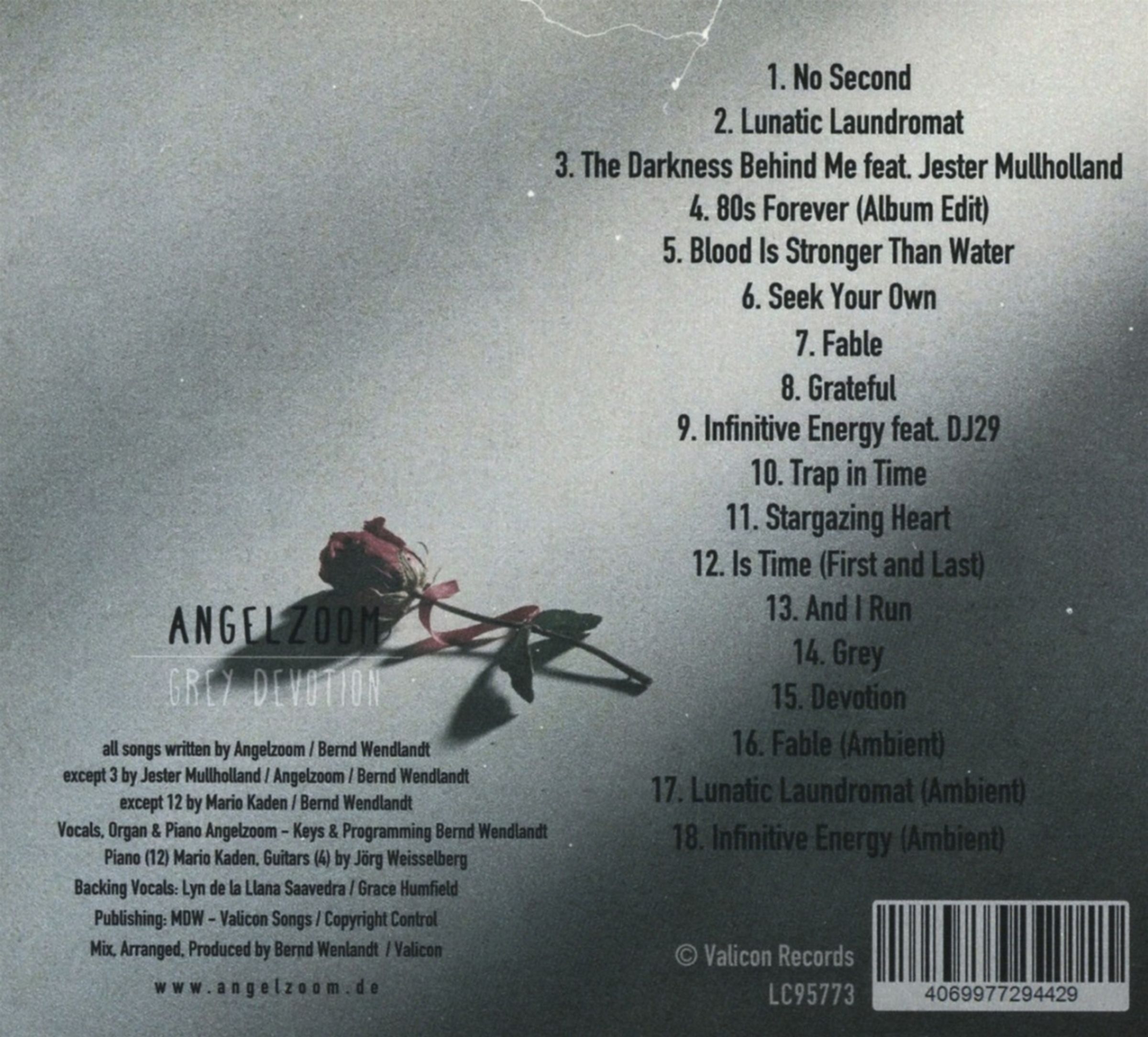 »Grey Devotion« – das lang erwartete 3. Album von Angelzoom erscheint am 24. April 2026 und vereint 80s-Synthwave mit gothic-romantischer Tiefe. Dunkle Elektronik trifft emotionale Texte über Hingabe, Verlust und Wiedergeburt – inspiriert von klassischen 80s Synth-Balladen mit düsterer Seele oder Darkwave-Pionieren der elektronischen Melancholie.