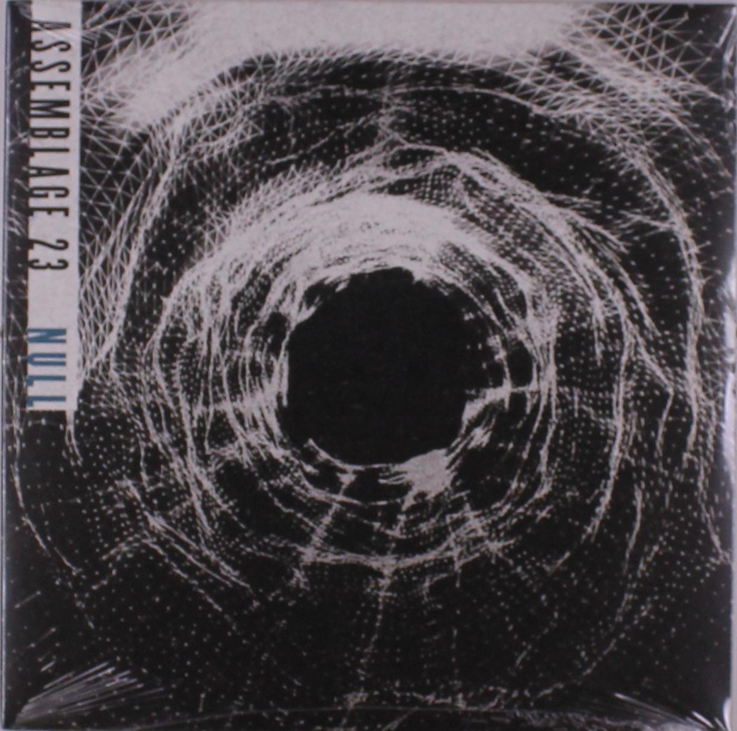 Links Text: "ASSEMBLAGE 23 NULL". Eine abstrakte, wirbelnde Netzstruktur um einen schwarzen Kreis., LP