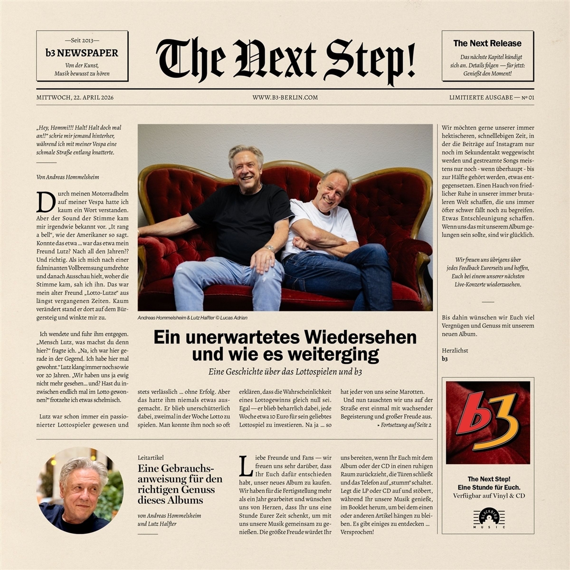 kompakter, direkter und fokussierter als auf früheren Veröffentlichungen. Mit THE NEXT STEP!" senden b3 ein klares Signal: Die Band ist bereit für den nächsten Schritt - musikalisch wie persönlich. Die Doppel-Vinyl kommt in einem aufwändig gestalteten 76-seitigen MediaBook, das mit exklusiven Fotos, persönlichen Geschichten, Interviews, Songtexten und Noten einen tiefen Einblick in die Welt der Band bietet - zweisprachig in Deutsch und Englisch.