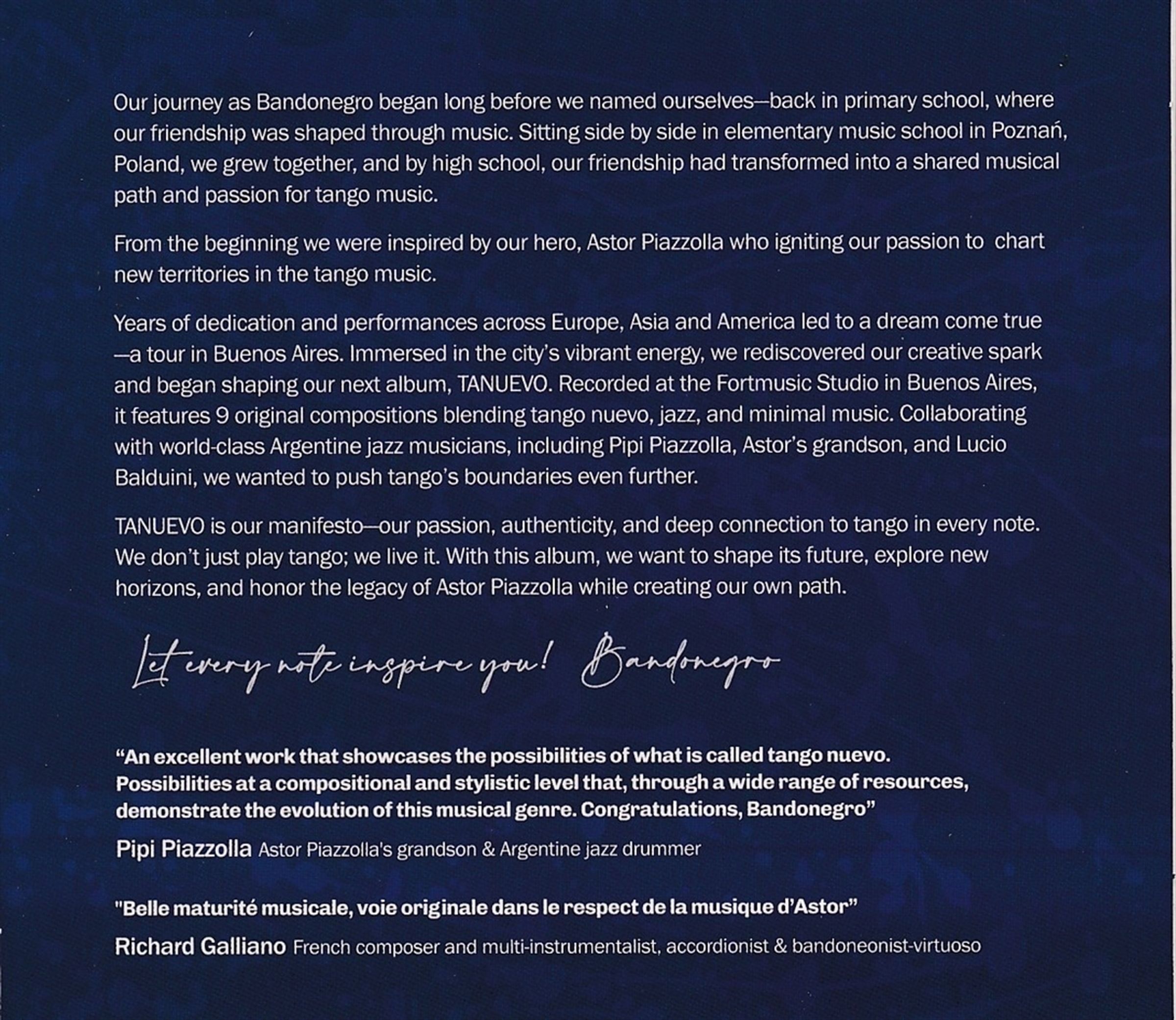 Bandonegro gilt als einer der faszinierendsten und bekanntesten Interpreten des Genres. »Tanuevo« präsentiert sowohl traditionellen argentinischen Tango als auch Tango Nuevo und kreiert eigene Kompositionen mit Elementen aus Jazz und klassischer Musik. Mit ihrer außergewöhnlichen Leidenschaft für Musik, gepaart mit frischen Klängen, der eigenen musikalischen Idee und nicht zuletzt dem ausgezeichneten Feingefühl für den Tango als Tanz erobern die Polen weltweit die Herzen ihrer Zuhörer und werden als eines der besten Tango-Ensemble der jungen Generation gelobt.