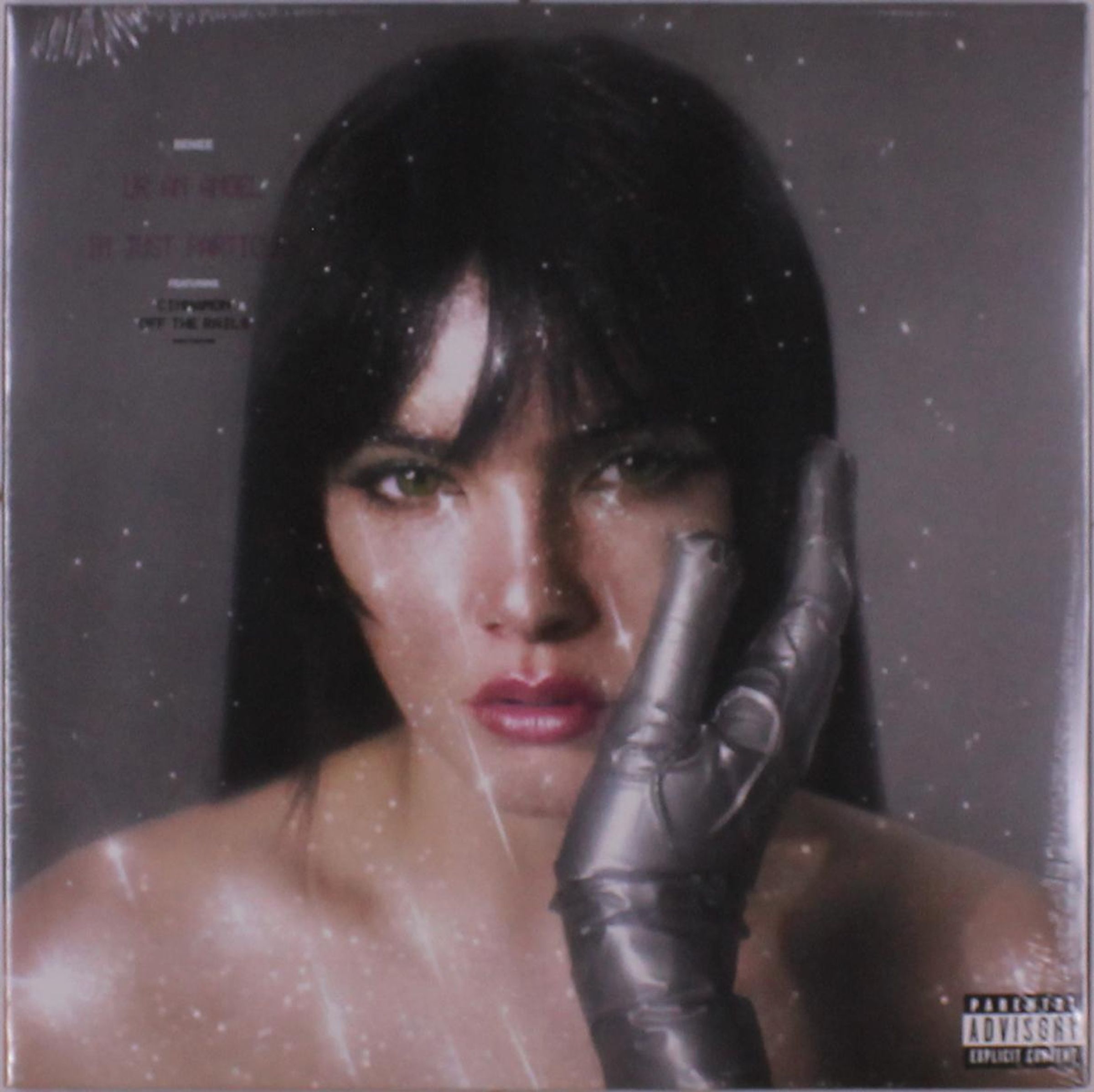 Texte: "Featuring Chromeo, Off The Rails." Porträt einer Frau mit schwarzem Haar, ein Handschuh berührt ihr Gesicht., LP
