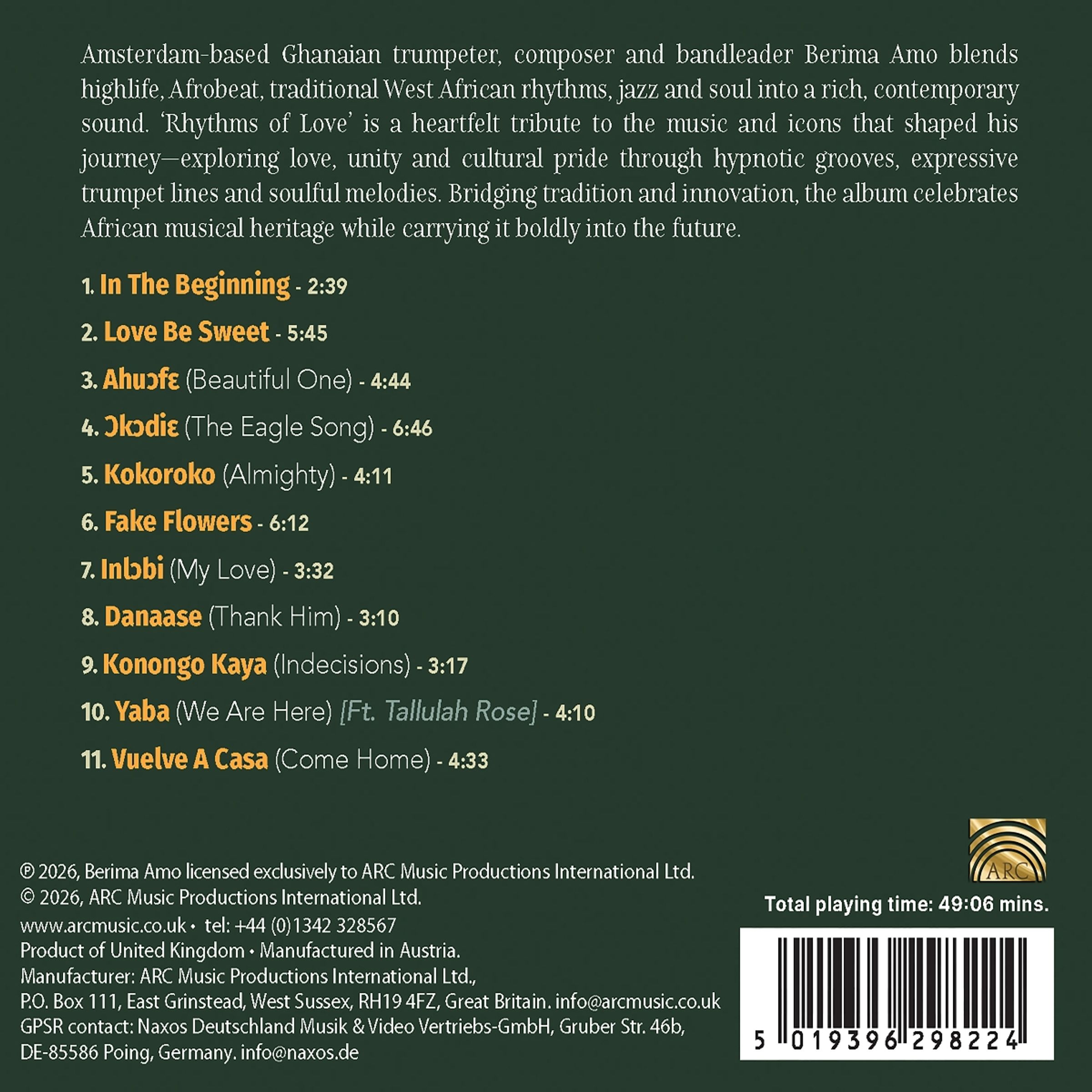Berima Amos Neo-Highlife-Stil bringt sowohl traditionelle als auch zeitgenossische Musik zusammen, indem er Highlife, Afrobeat, traditionelle westafrikanische Rhythmen, Jazz und Soul mit modernen Klangen verbindet. "Rhythms of Love" ist eine aus dem Herzen kommende Hommage an die Musik und die Ikonen, die seine Reise gepragt haben. Mit hypnotischen Grooves, ausdrucksstarken Trompetenlinien und gefuhlvollen Melodien erkundet er Liebe, Einheit und