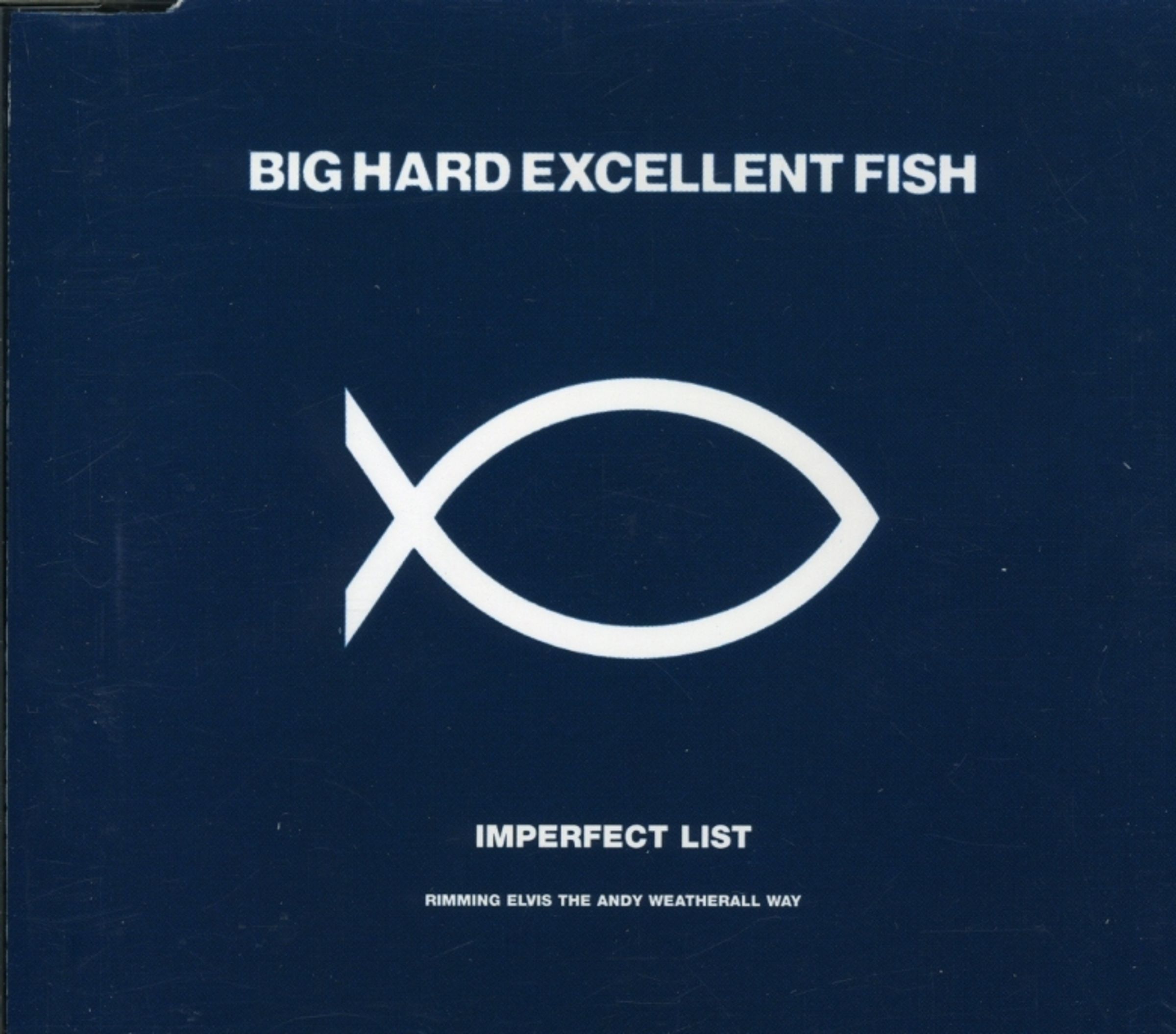 Ein dunkles Design zeigt die Texte: "BIG HARD EXCELLENT FISH", "IMPERFECT LIST" und ein stilisiertes Fischsymbol., CD