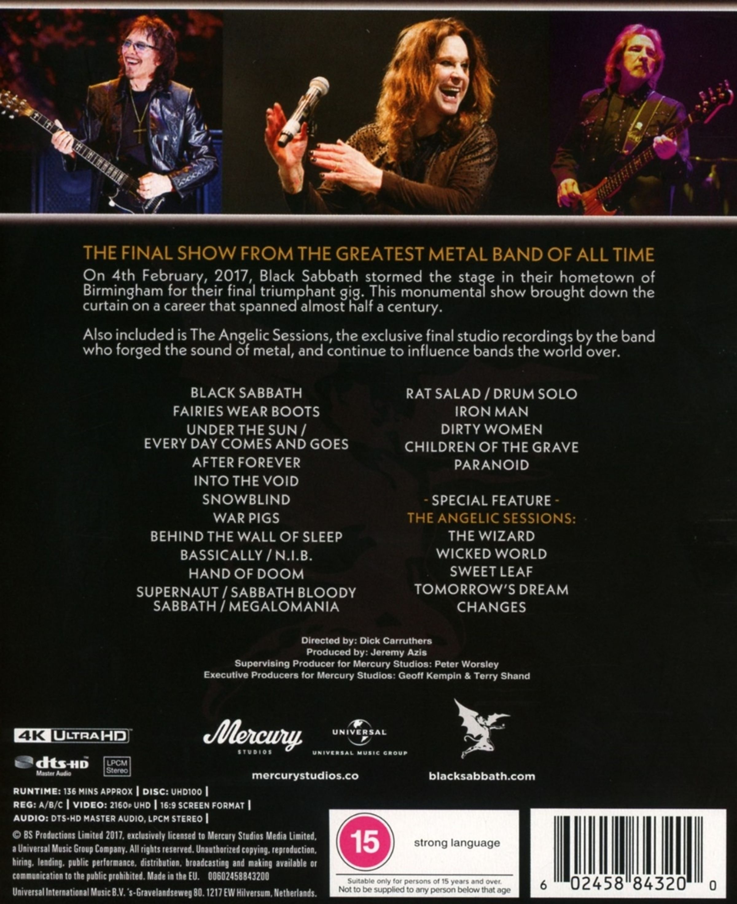 Nachdem bereits mehr als anderthalb Millionen Fans zur »The End«-Tournee von Black Sabbath gekommen waren, spielten Ozzy Osbourne, Tony Iommi, Geezer Butler, Tommy Clufetos und Adam Wakeman am 4. Februar den letzten Auftritt ihrer gigantischen Konzertreise, und zwar in ihrer Heimatstadt Birmingham. Dieser denkwürdige letzte Auftritt wird nun als 4k UHD100 erhältlich sein. Die 4K UHD enthält das Bonus-Feature The Angelic Sessions, einen Blick auf die Band im Studio, wie sie eine Auswahl ihrer Lieblingssongs spielt, die sie auf der Tour nicht gespielt hat.