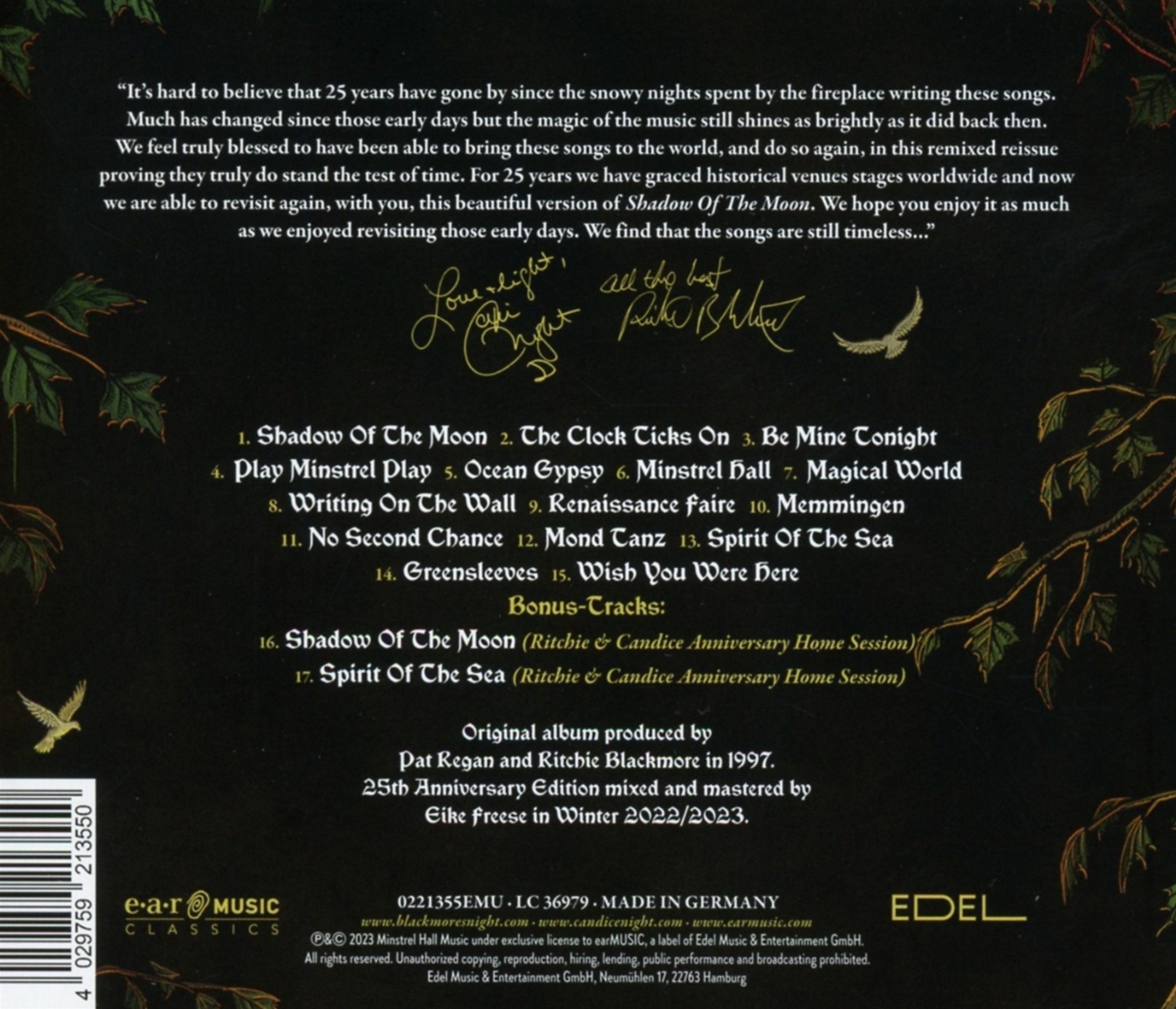 »Es ist kaum zu glauben, dass seit den verschneiten Nächten am Kamin, in denen wir diese Songs geschrieben haben, 25 Jahre vergangen sind. Vieles hat sich seit diesen frühen Tagen verändert, aber die Magie der Musik strahlt immer noch so hell wie damals. Wir fühlen uns wahrhaftig gesegnet, dass wir diese Lieder in die Welt bringen konnten, und tun dies mit dieser neu abgemischten Wiederveröffentlichung erneut, die beweist, dass sie wirklich den Test der Zeit bestehen. Seit 25 Jahren zieren wir die Bühnen historischer Orte auf der ganzen Welt, und jetzt können wir diese wunderschöne Version von ›Shadow Of The Moon‹ mit euch noch einmal erleben. Wir hoffen, dass sie Ihnen genauso viel Spaß macht, wie uns das Wiedererleben dieser frühen Tage. Wir finden, dass die Songs immer noch zeitlos sind...« (Candice Night & Ritchie Blackmore)