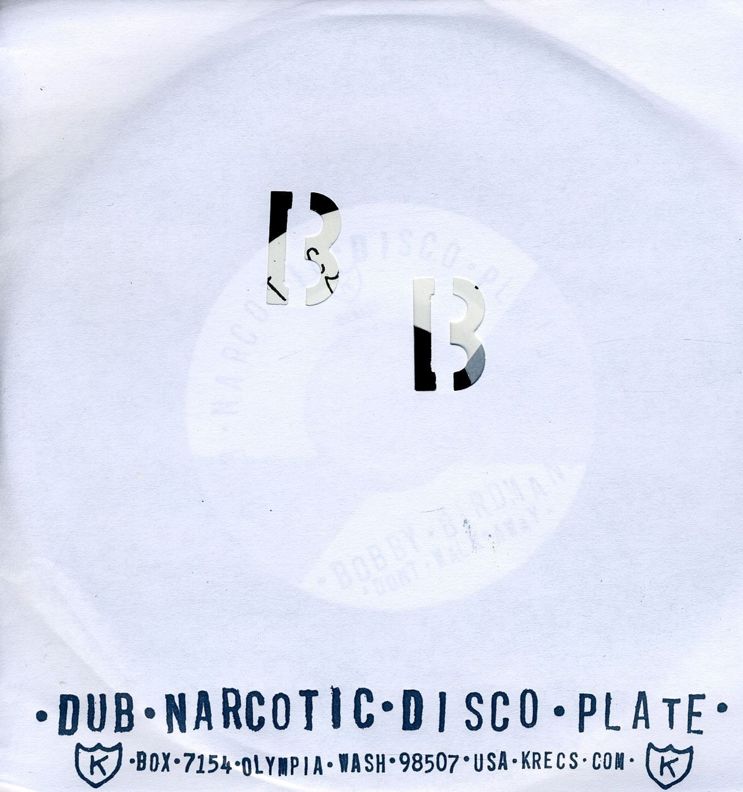 Text: "Dub Narcotic Disco Plate." Zwei stilisierte, schattierte "B"-Buchstaben auf hellem Hintergrund. Unten Kontaktinfo., Single 7"