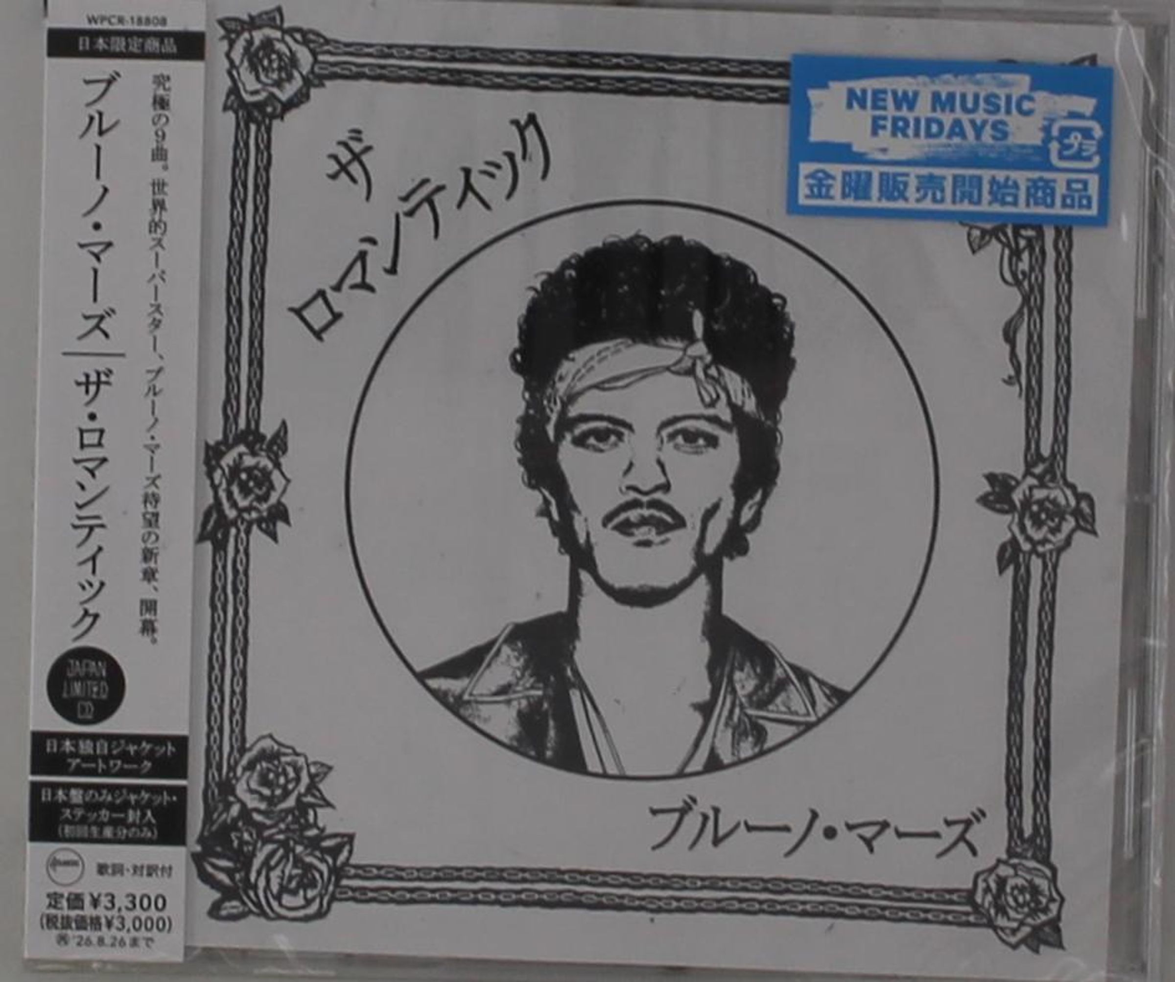 "New Music Fridays" in Blau, stilisierte Zeichnung eines Mannes mit Locken und Stirnband, umrahmt von Rosen., CD