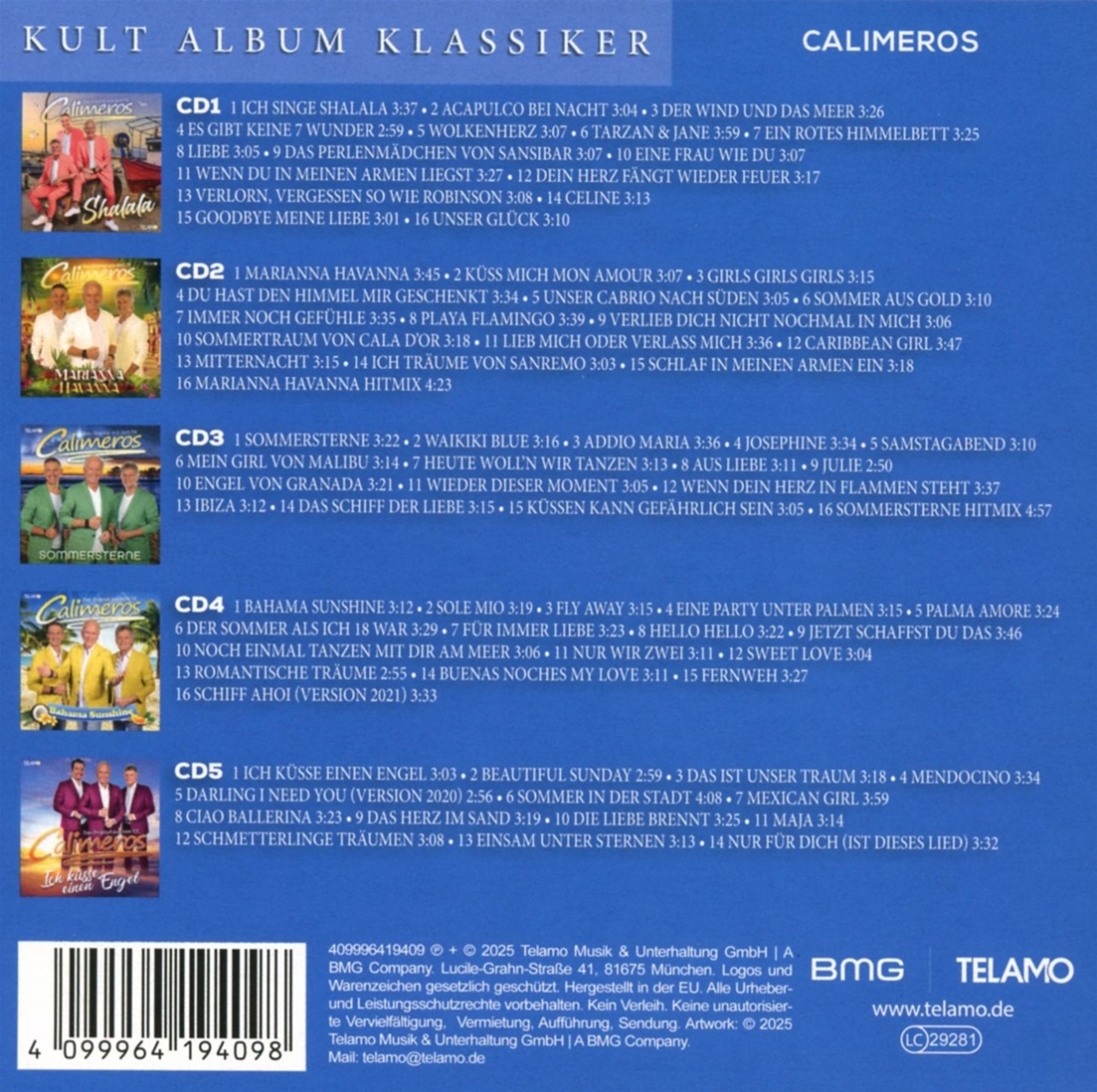 Dieses exklusive Set umfasst insgesamt 5 CDs, gefüllt mit den unvergesslichen Alben von den Calimeros. Diese Sammlung kombiniert aktuelle Hits und zeitlose Klassiker, die Fans des deutschen Schlagers seit Jahren begeistern. Die Kult-Alben der Schlagerband, vereint in einem einzigartigen 5-CD-Set!