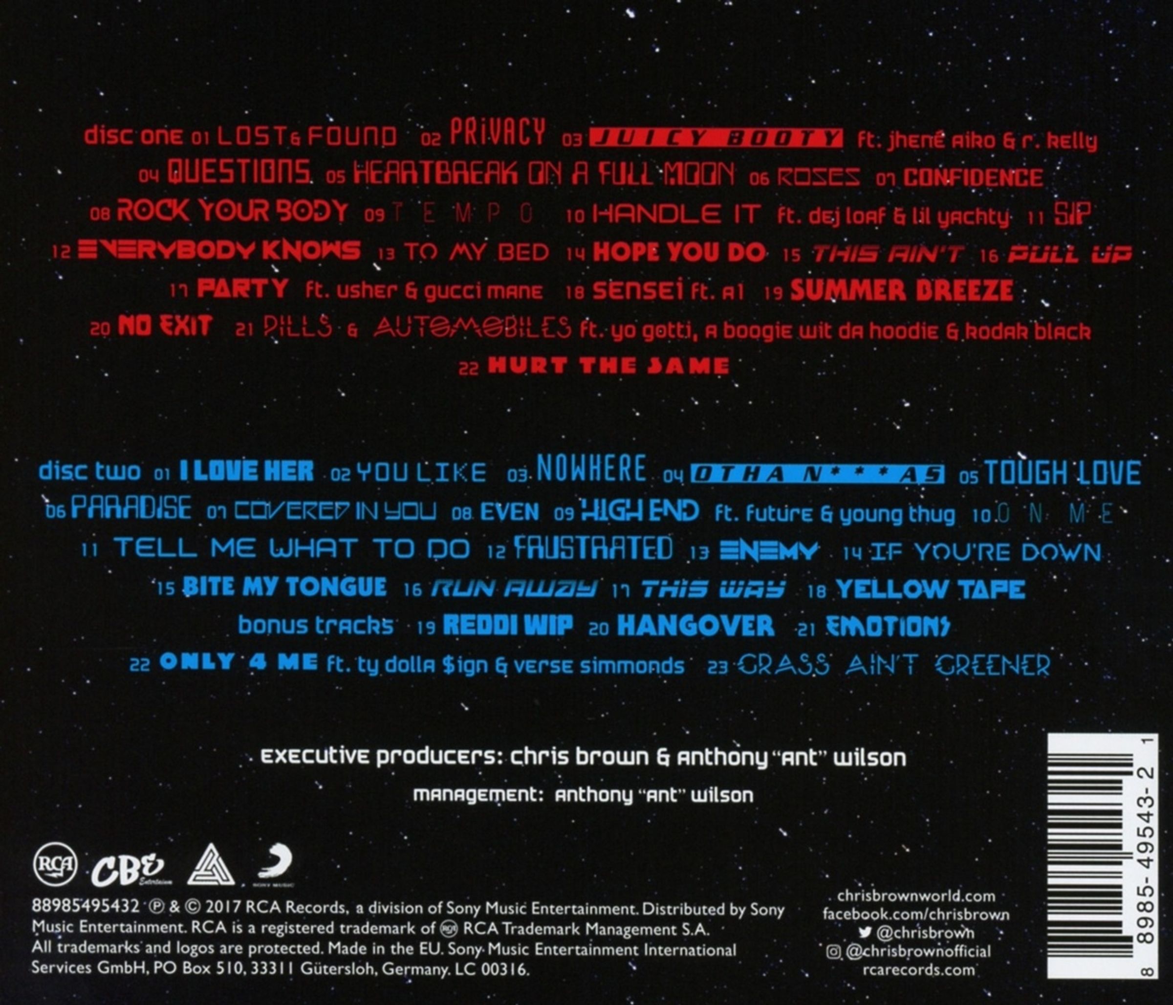 Mit »Heartbreak On A Full Moon« veröffentlicht US-Sänger Chris Brown sein mittlerweile neuntes Studioalbum. Der Lonplayer umfasst 45 (!) brandneue Songs und featured u. a. Usher, Gucci Mane, Young Thug, Future, Yo Gotti und viele mehr. Als Vorboten auf das Album gab es bereits die vier Vorabsingles »Questions«, »Pill & Automobiles«, »Party« und »Privacy« zu hören.