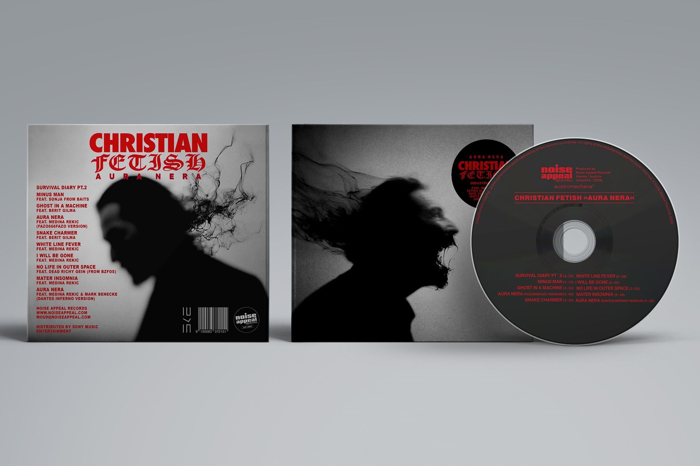 "CHRISTIAN FETISH AURA NERA" in roten Buchstaben. Silhouette eines schreienden Mannes mit rauchähnlichem Effekt am Kopf., CD