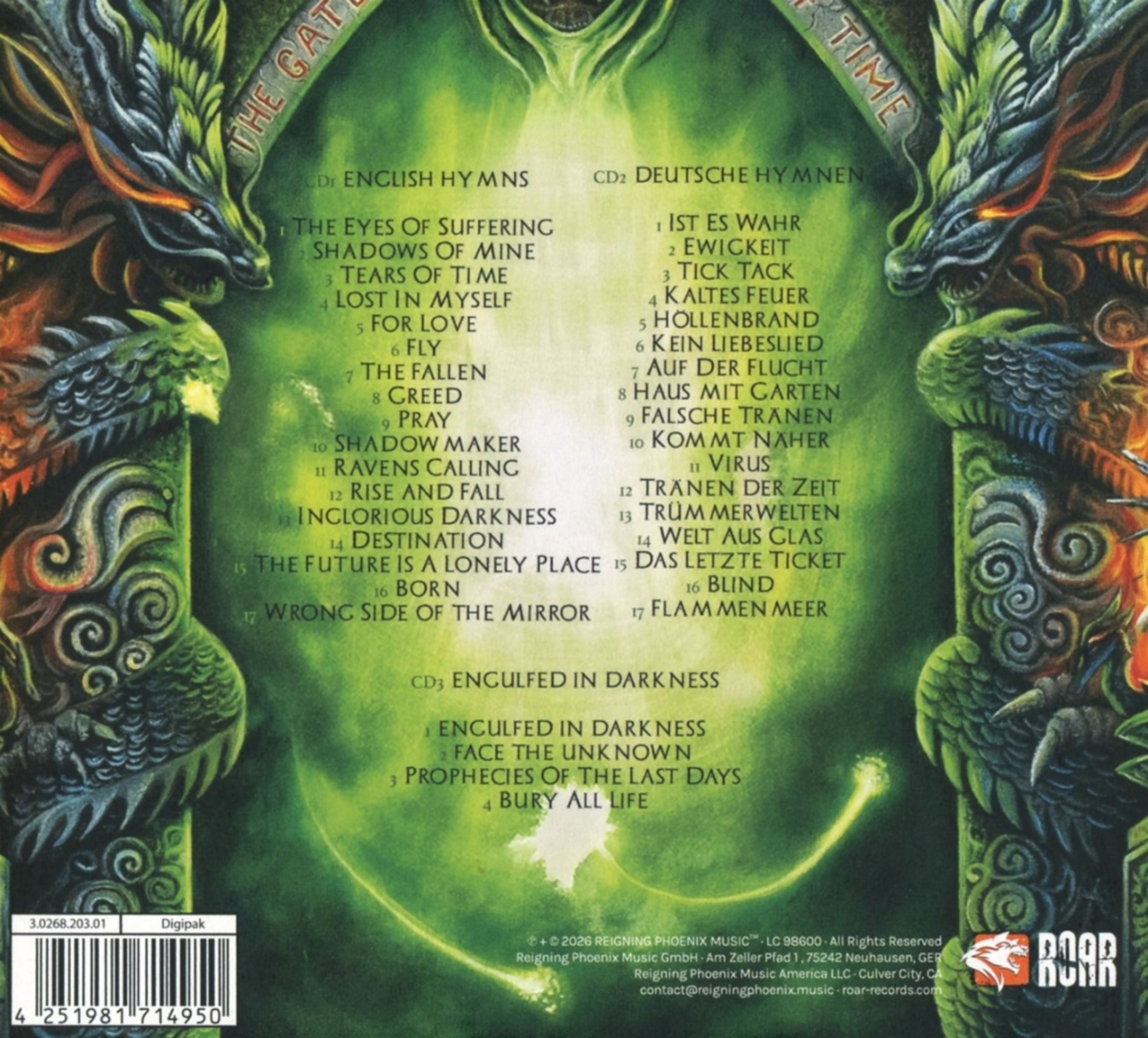 »English Hymns and Deutsche Hymnen« würdigt das Vermächtnis von Crematory, einer der beständigsten Gothic-Metal-Bands Deutschlands. Das CD-Digipack enthält drei Discs: »English Hymns« (ausgewählte englische Titel), »Deutsche Hymnen« (deutsches Repertoire) und »Engulfed in Darkness«, das erste Demo, das hier erstmals offiziell veröffentlicht wird. Sowohl die englische als auch die deutsche Disc enthalten zwei bisher unveröffentlichte Bonustracks.