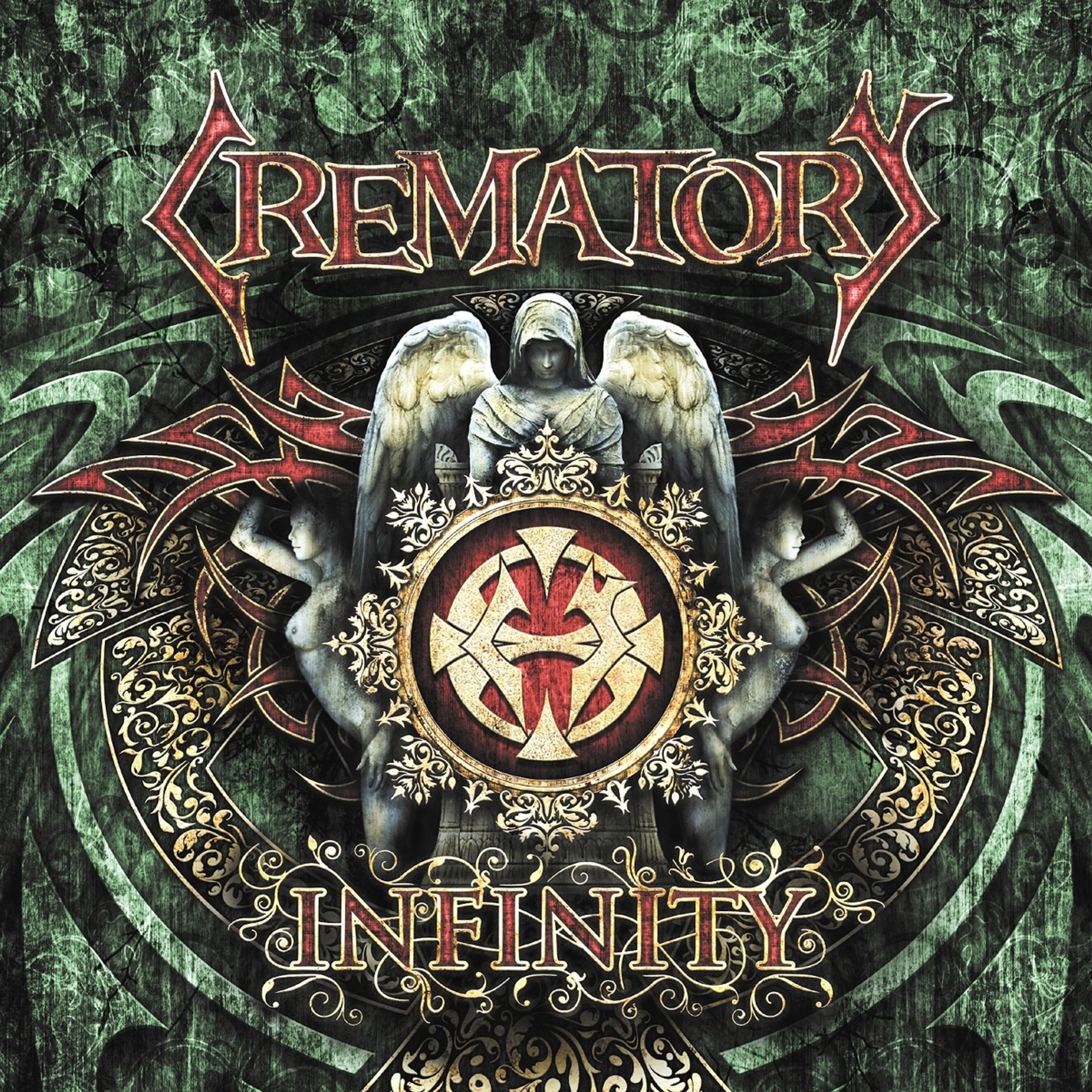 "Crematory" oben, "Infinity" unten. Ein Engel mit Flügeln und kunstvollen Mustern auf grünem Hintergrund., CD