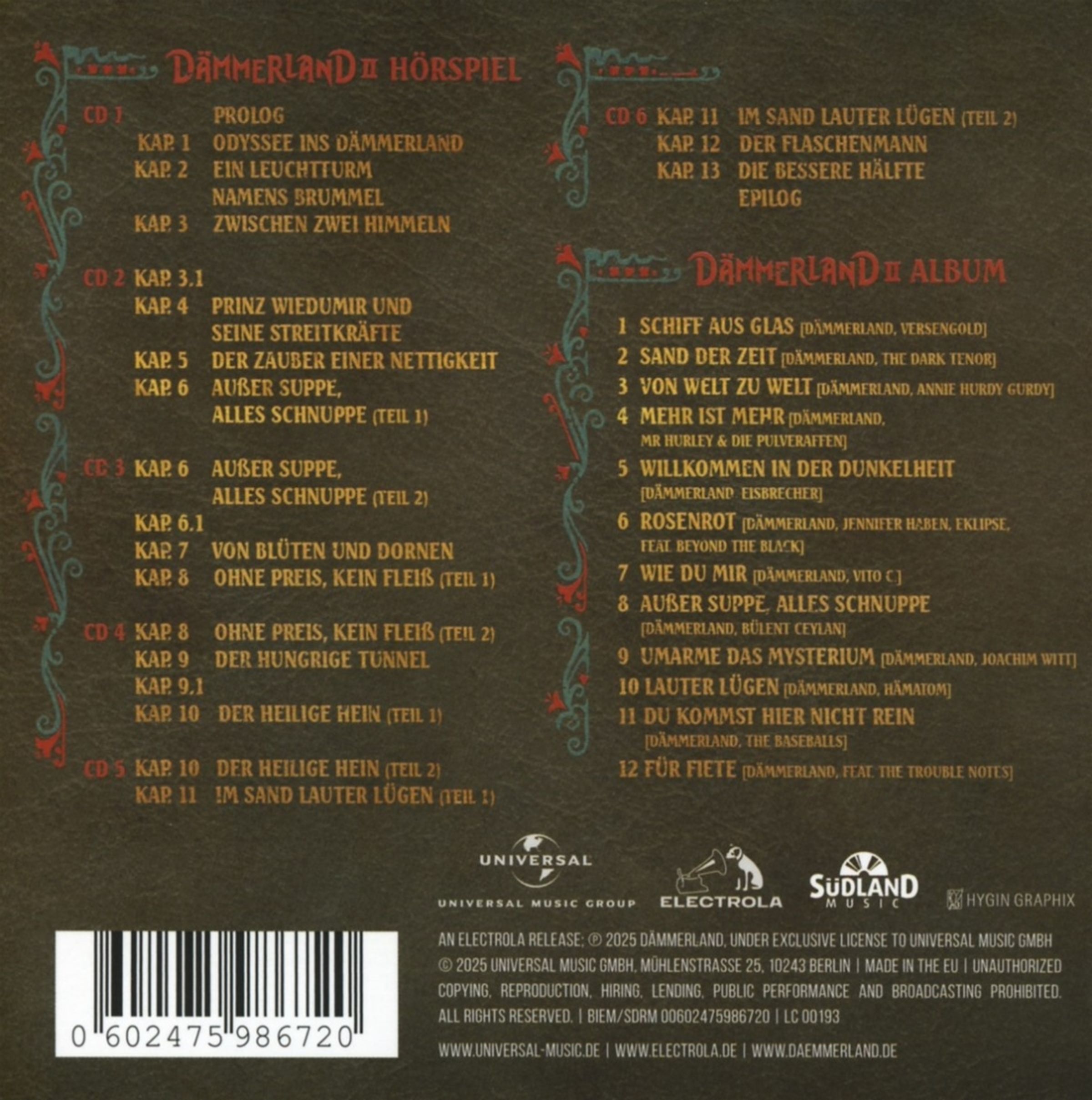 Die erweiterte Deluxe Edition vereint insgesamt 7 CDs in einer Klappbox – 1x das "Dämmerland II“-Album mit 12 neuen Songs, dazu gibt es den kompletten Hörspiel-Nachfolger mit rund 6, 5h Spieldauer auf 6 weiteren CDs. Auch visuell ein echter Hingucker, gibt es obendrein einen Voucher mit dem Download-Link fürs digitale Hörspiel.