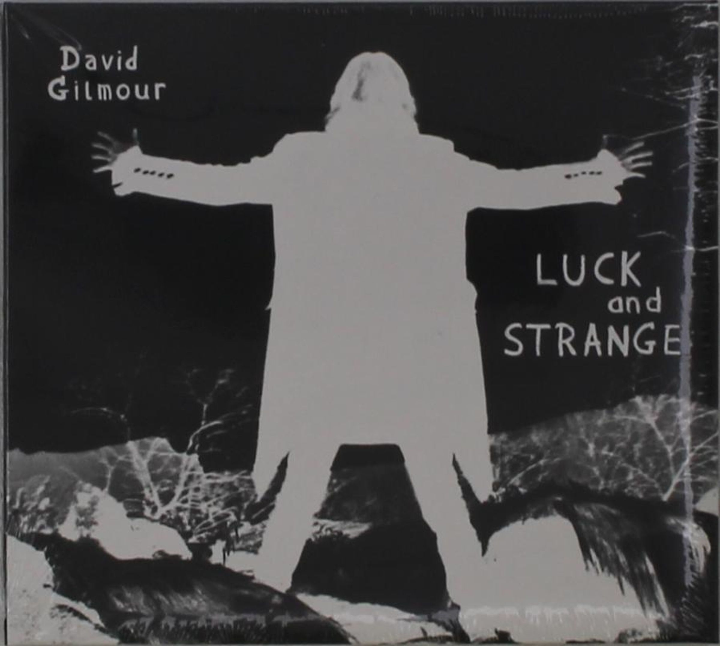 "David Gilmour" oben links, "Luck and Strange" rechts. Silhouette einer Person mit ausgestreckten Armen im Vordergrund., CD