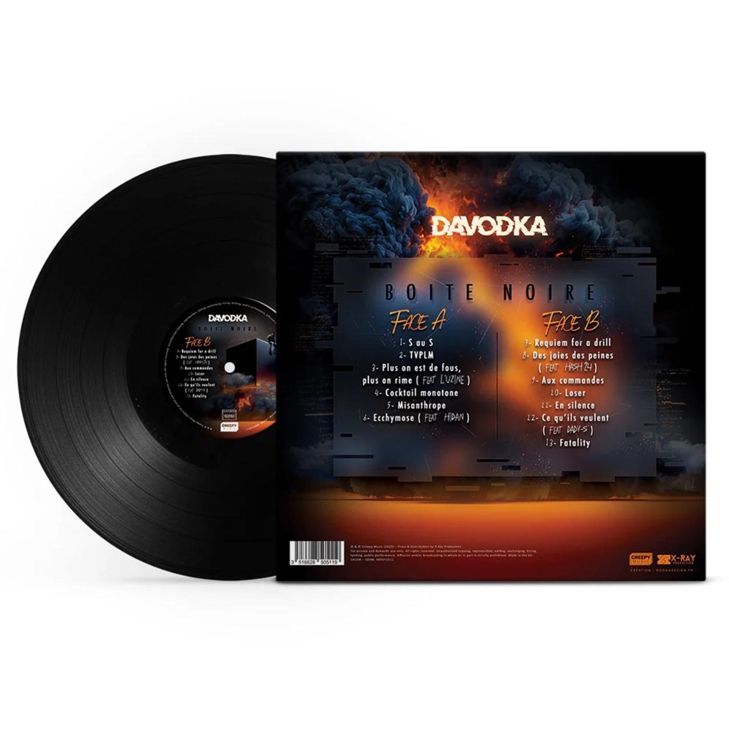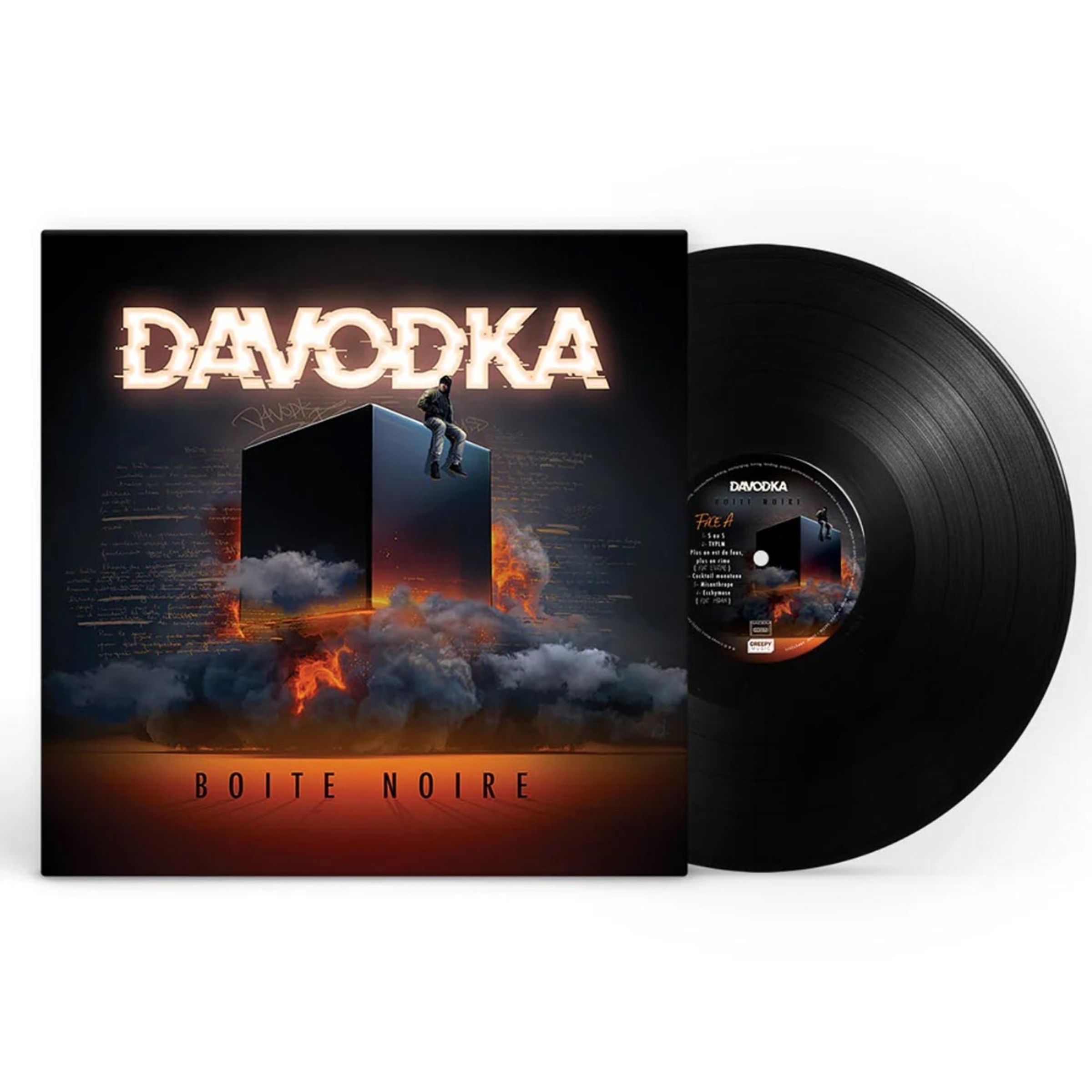 Text: "DAVODKA", "BOITE NOIRE". Illustration: Ein Mann sitzt auf einem schwarzen Würfel, umgeben von Rauch und Flammen., LP
