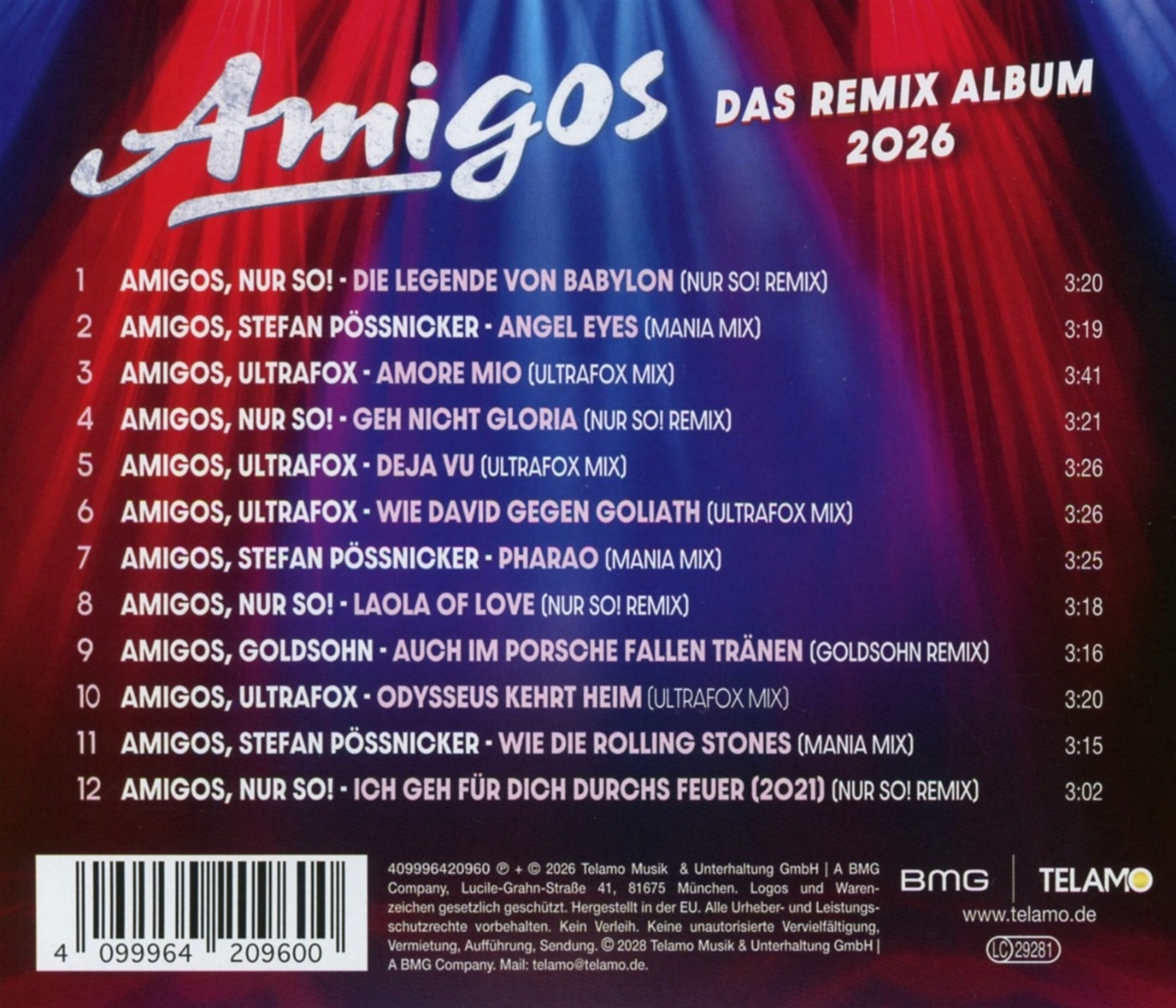 Insgesamt enthält das Album 12 Titel, darunter 10 brandneue Remixe großer Erfolge und 2 bereits veröffentlichte Remix-Versionen, die bisher nur auf Fan-Editionen zu hören waren. Damit verbinden die Amigos Tradition und Moderne auf charmante Weise. Was einst auf den Bühnen der Tanzdielen begann, erklingt nun mit neuem Beat – eine Hommage an 55 Jahre Leidenschaft und Lebensfreude. Die Amigos zeigen damit, dass sie nicht stehen bleiben, sondern ihren Weg mit Herz und Mut weitergehen. Ein Album, das Generationen verbindet – »Amigos - Das Remix Album 2026«, das ist die Vergangenheit im Takt der Zukunft.