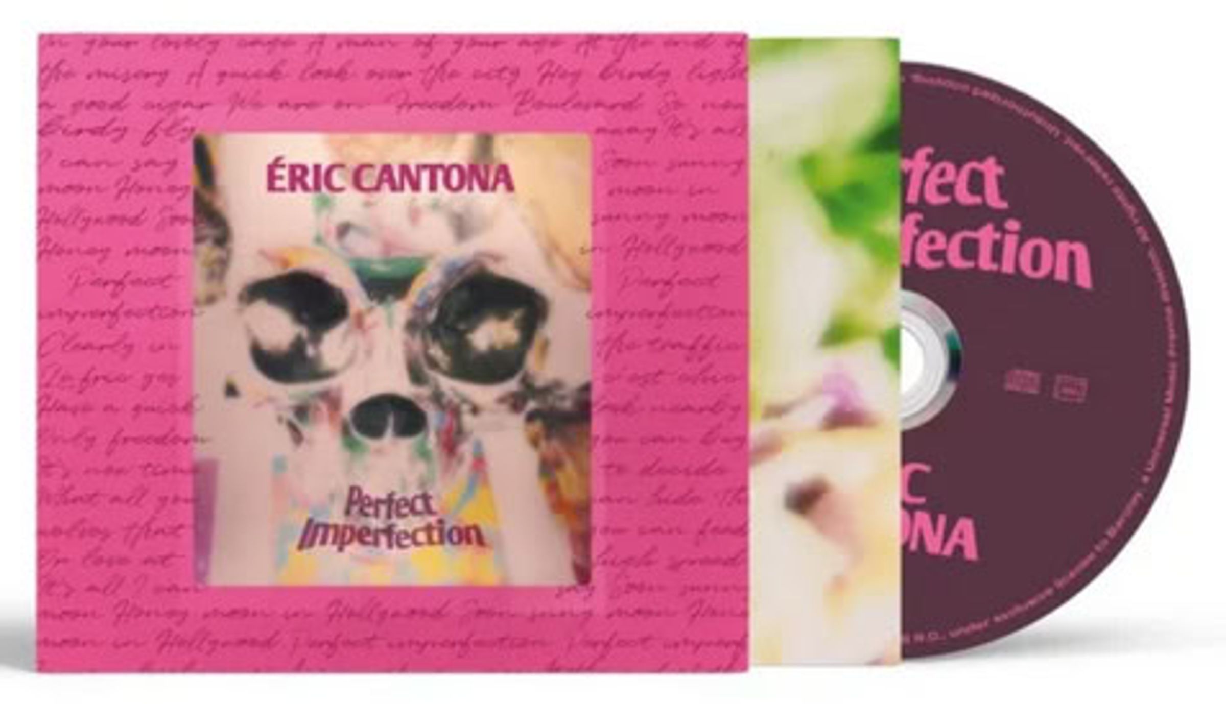 Text: "Éric Cantona Perfect Imperfection." CD in pinker Hülle. Enthält künstlerisches, buntes, verschwommenes Motiv., CD