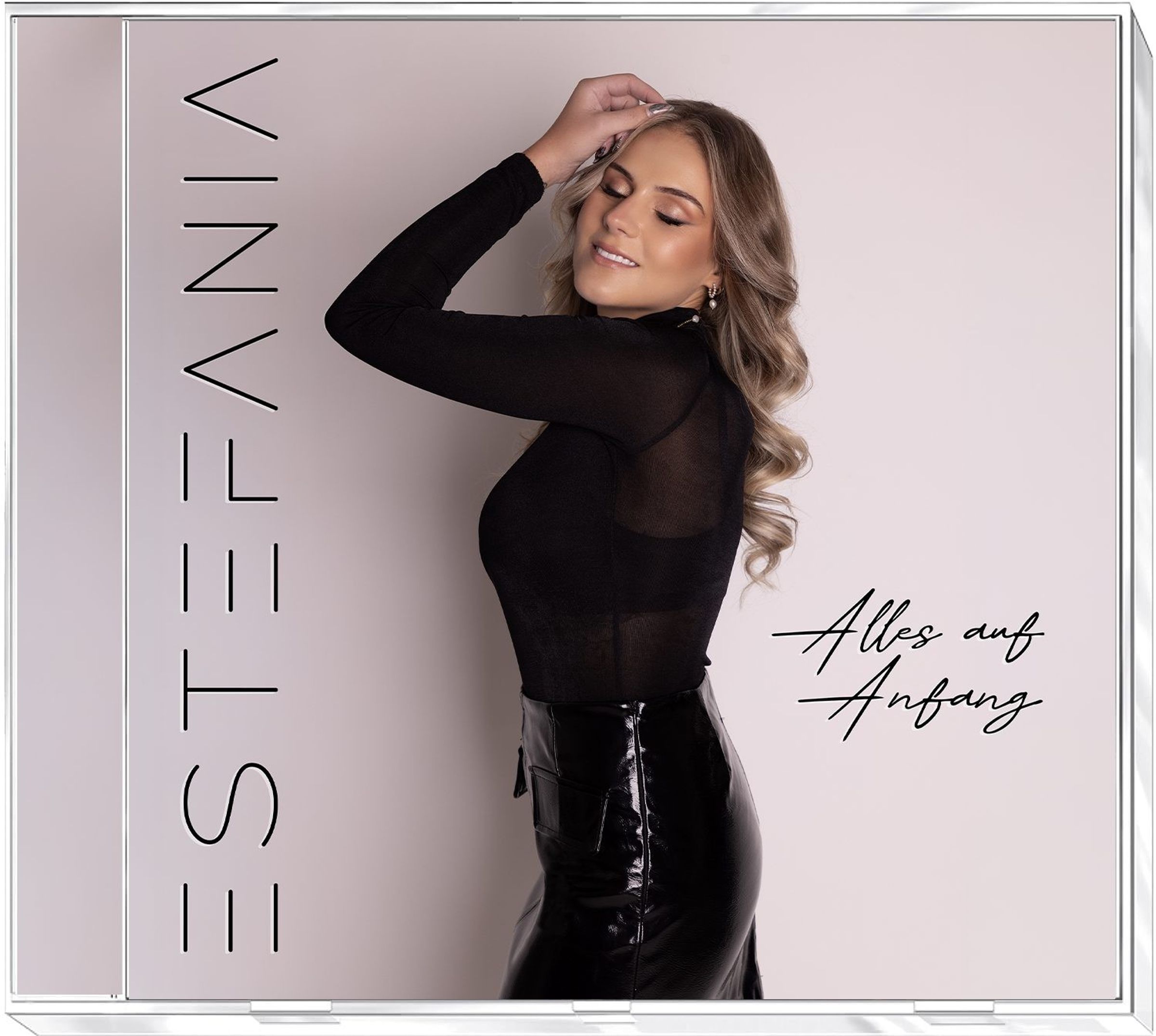 Text: „ESTEFANIA“ vertikal links und „Alles auf Anfang“ rechts. Frau in schwarzem Oberteil und Lederrock posiert lächelnd., CD
