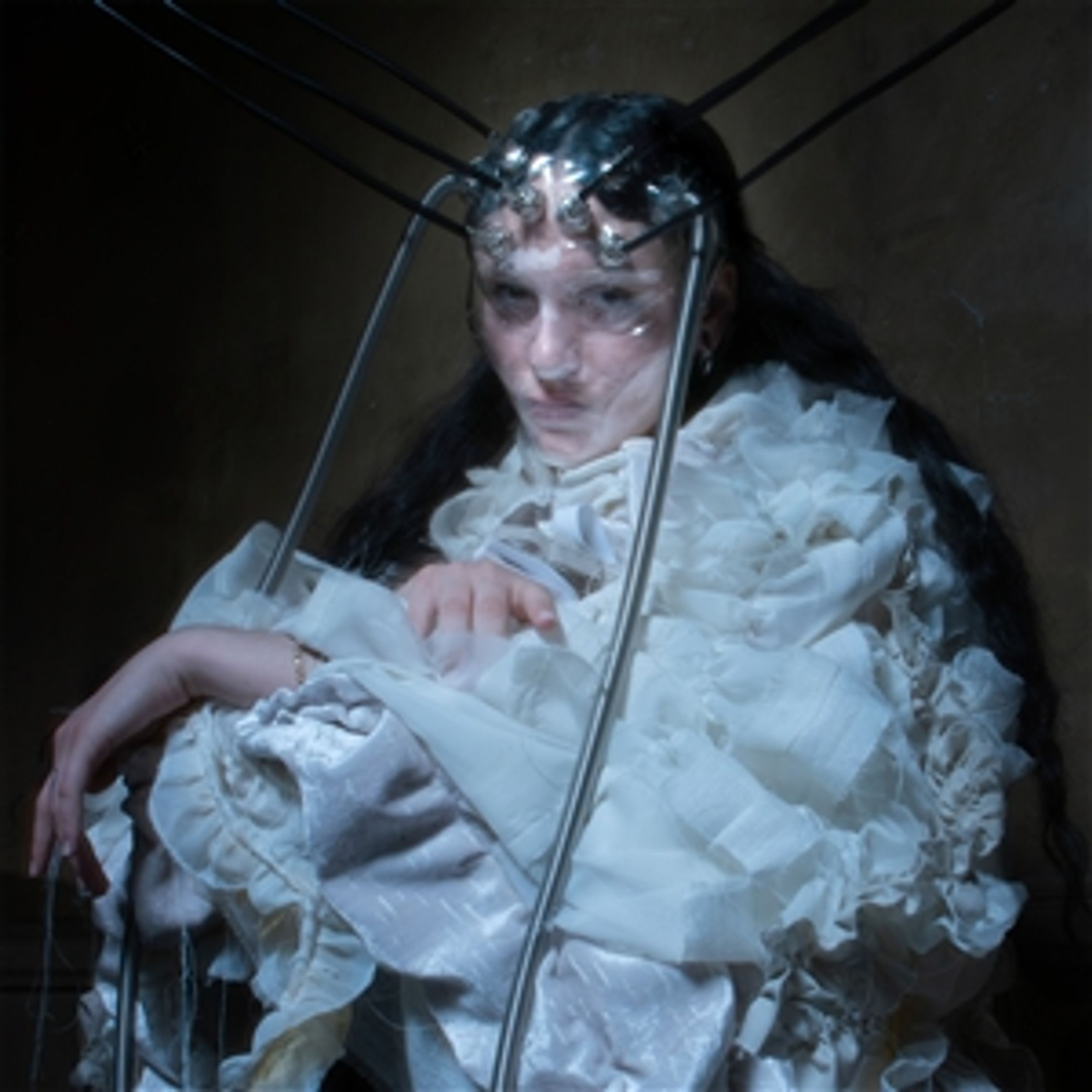 Es gibt keinen Text oder Logo. Eine Person in einem weißen, voluminösen Kleid trägt eine Art metallischen Kopfschmuck., LP