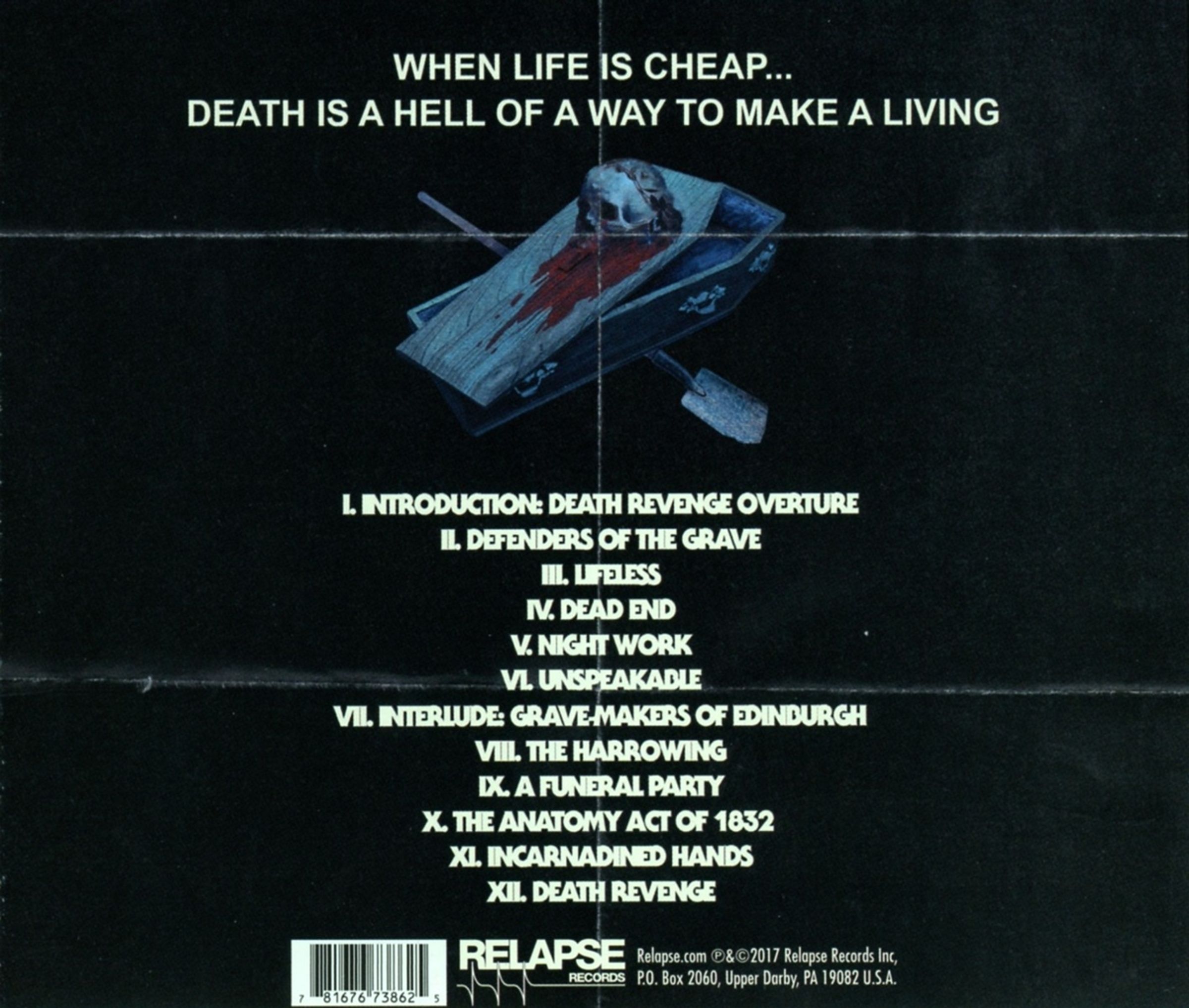»Death Revenge« erzählt die makabre Geschichte von einer Reihe von brutalen Morden, die begangen wurden, um die Leichen der Opfer an Anatomen zu verkaufen, von grausamem Handel und von schädlichem Grabraub in der Unterwelt der späten 1820er Jahren in Edinburgh, Schottland.