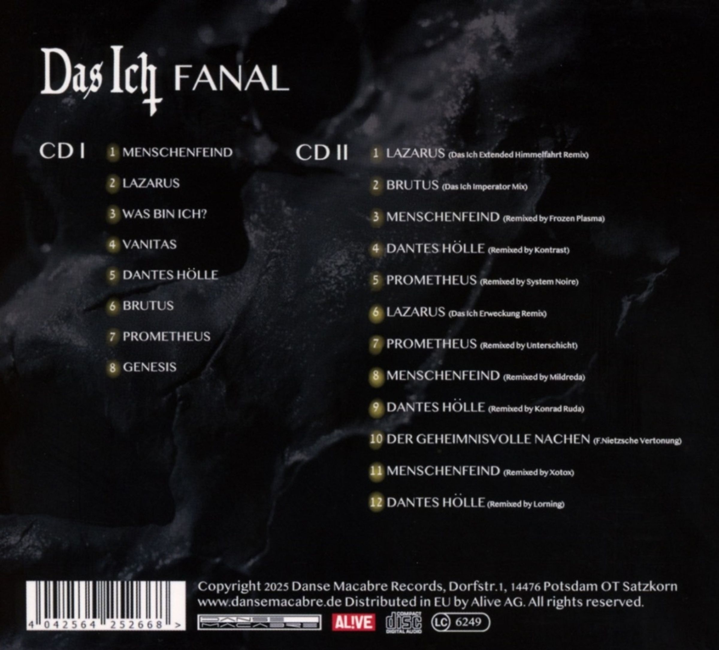 Das Ich, die Wegbereiter der Neuen Deutschen Todeskunst, melden sich nach Jahren der Stille mit ihrem lang erwarteten Album Fanal zurück. Das Album, dessen Titel Fackel oder Leuchtfeuer bedeutet, ist ein brennendes Zeugnis einer untergegangenen Zivilisation. Aus den Trümmern menschlicher Errungenschaften und zerbrochener Ideale zusammengesetzt, warnt Fanal vor den Geistern der Vergangenheit und Gegenwart, die durch die Ruinen unserer Welt geistern. Mit ihrer einzigartigen Mischung aus elektronisch-sinfonischen Klängen, expressionistischer Lyrik und harschen Industrial-Elementen schaffen Stefan Ackermann und Bruno Kramm ein Werk, das sowohl musikalisch als auch thematisch tief unter die Haut geht.
