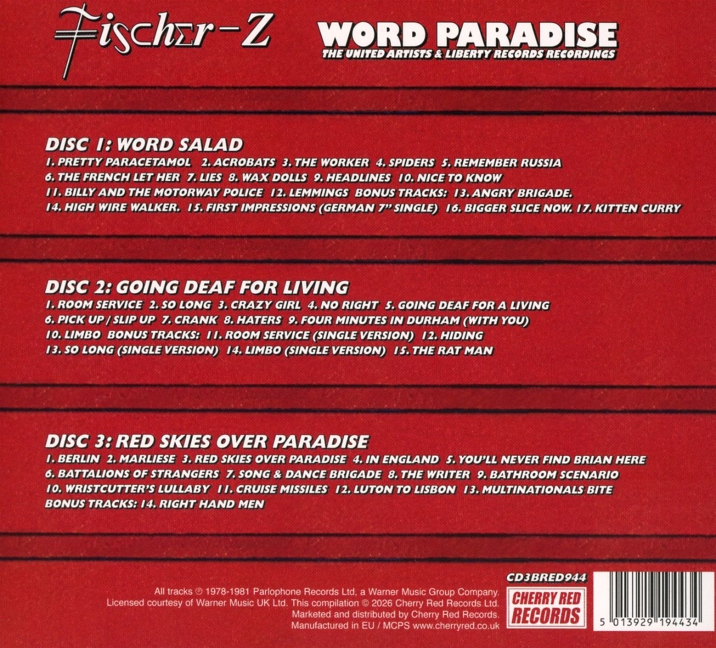 Diese 3-CD-Anthologie enthält die ersten drei Alben von Fischer-Z – »World Salad«, »Going Deaf For A Living« und »Red Skies Over Paradise« – sowie Bonustracks.