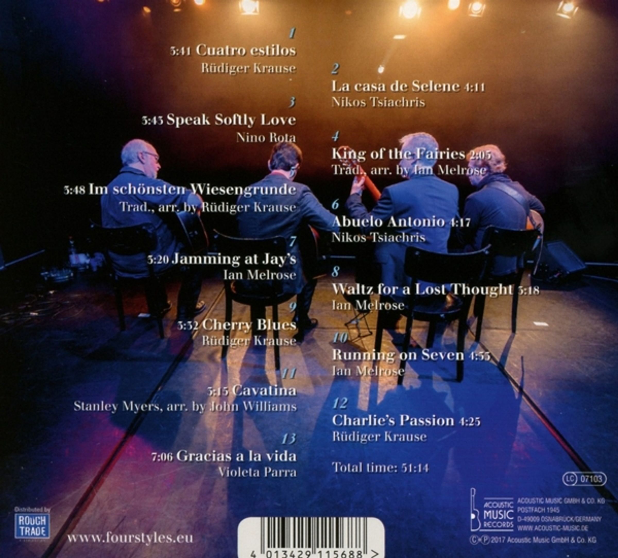 Die Gitarre, eines der beliebtesten Instrumente unserer Zeit, in vier unterschiedlichen Stilrichtungen: Jazz, Folk, Klassik & Flamenco. Vier Meister ihres Faches, Rüdiger Krause (Jazz), Ian Melrose (Folk / Fingerstyle), Heiko Ossig (Klassik) und Nikos Tsiachris (Flamenco), treffen aufeinander und zelebrieren die Gitarre und ihre unvergleichlich vielfältigen Ausdrucksformen - in Solostücken, Duetten und Trios, vor allem aber in Quartett-Arrangements erzeugen die vier Gitarristen ein einzigartiges Klangbild, einen musikalischen und audiophilen Genuss höchster Qualität.