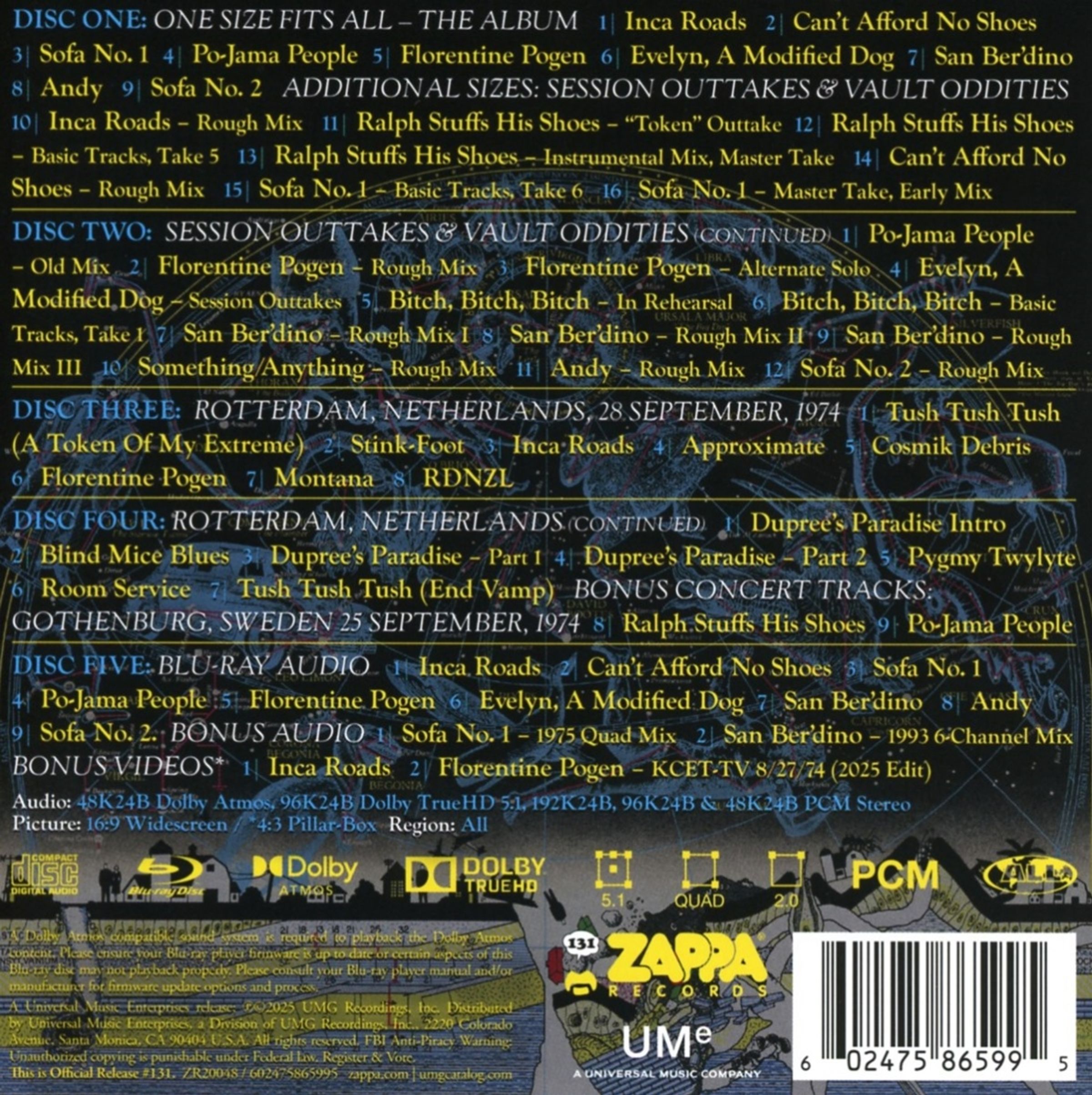 Die Blu-ray Disc enthält brandneue Dolby Atmos- und 5.1-Mischungen direkt von den 24-Spur-Masterbändern des Albums, Hi-Res-Versionen des Hauptalbums und zwei Bonus-Surround-Tracks mit alten Mixes von Zappa selbst. Außerdem sind zwei Bonusvideos von den klassischen KCET-TV-Dreharbeiten enthalten, die zum ersten Mal neu bearbeitet wurden, seit FZ 1974 das Material in die Hände bekam.