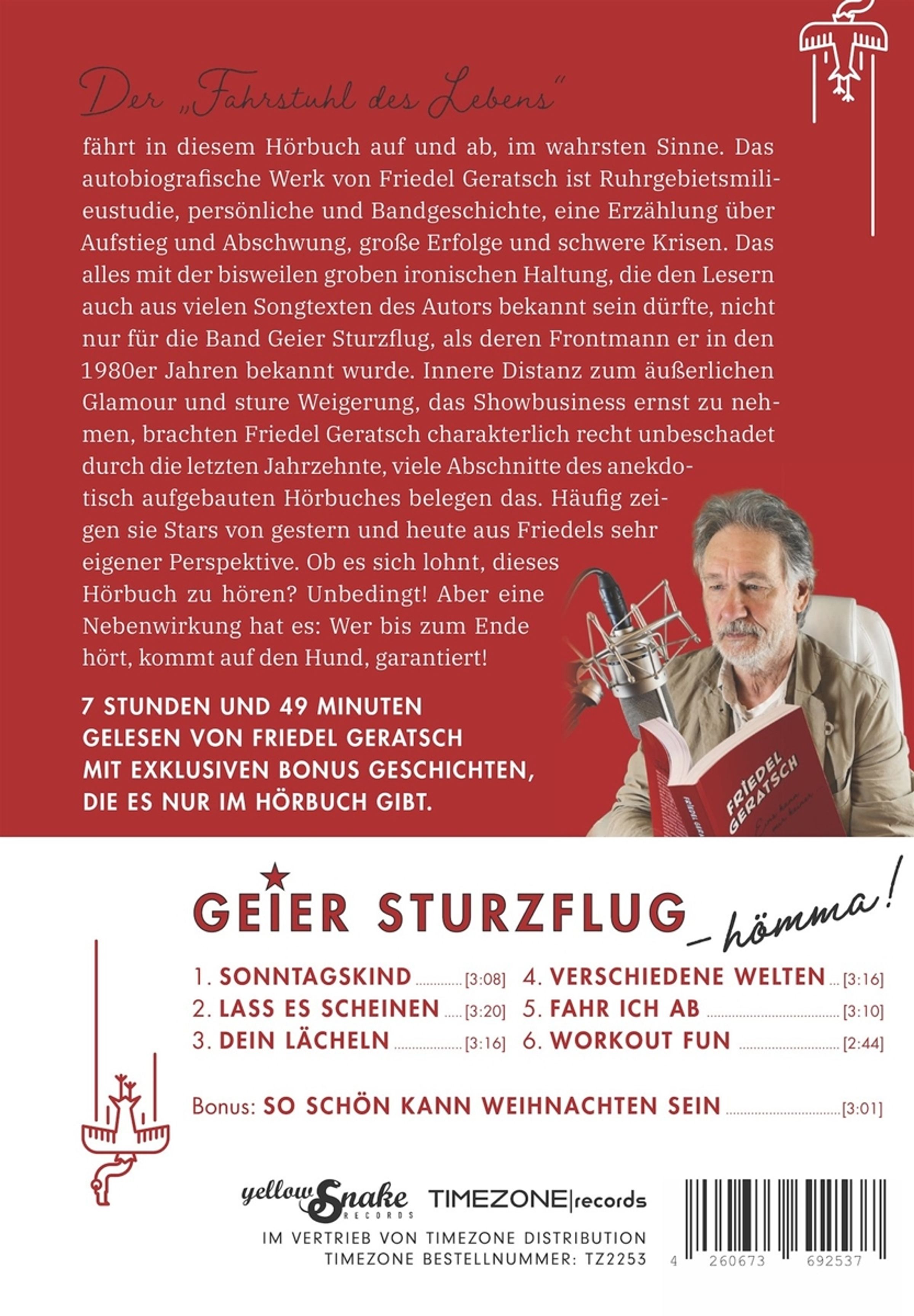 Der "Fahrstuhl des Lebens“ fährt in diesem Buch auf und ab, im wahrsten Sinne. Das autobiografische Werk von Friedel Geratsch ist Ruhrgebietsmilieustudie, persönliche und Bandgeschichte, eine Erzählung über Aufstieg und Abschwung, große Erfolge und schwere Krisen. Das alles mit der bisweilen groben ironischen Haltung, die den Lesern auch aus vielen Songtexten des Autors bekannt sein dürfte, nicht nur für die Band Geier Sturzflug, als deren Frontmann er in den 1980er Jahren bekannt wurde.