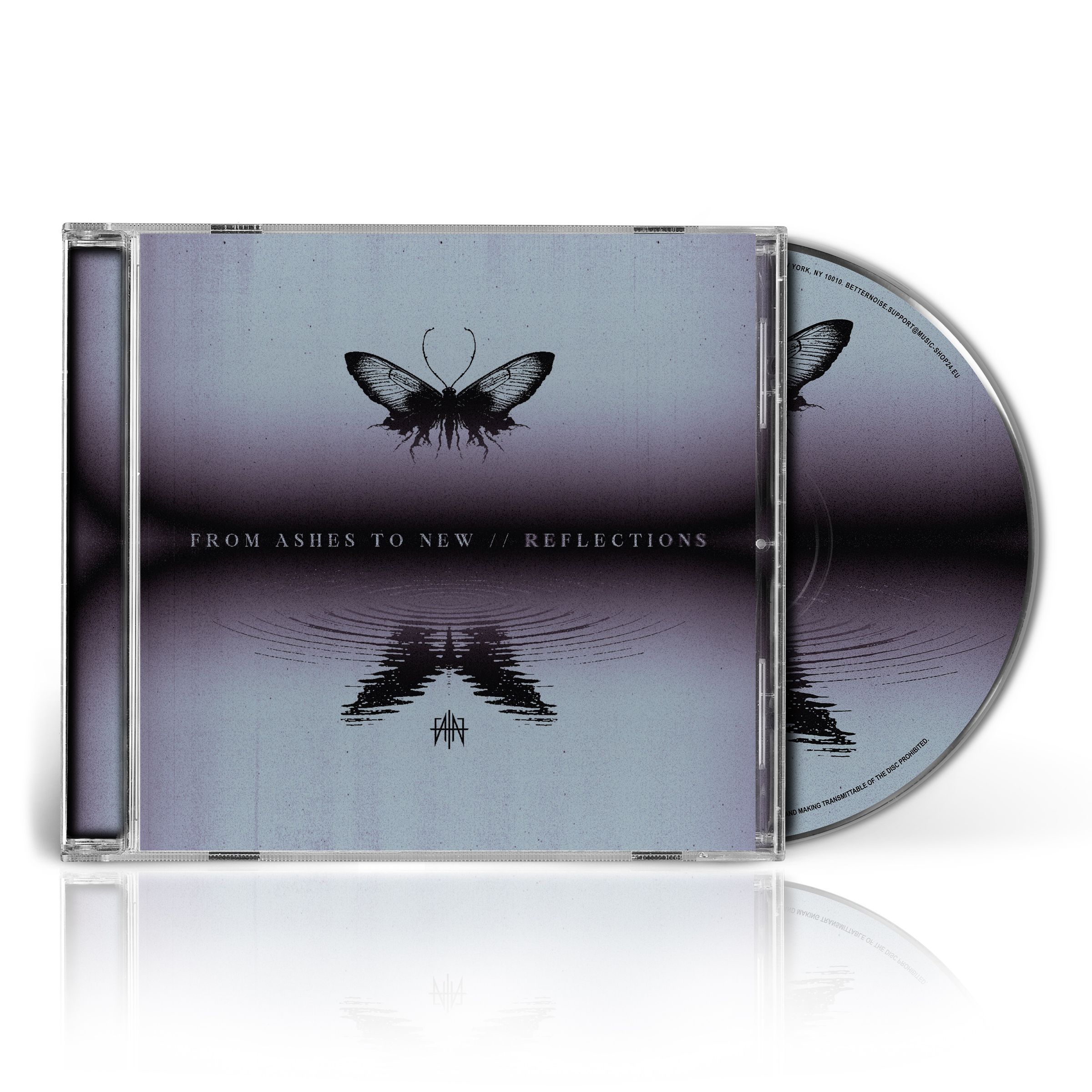 "FROM ASHES TO NEW // REFLECTIONS". Ein Schmetterlingslogo, unter Wasser gespiegelt auf lila Hintergrund., CD