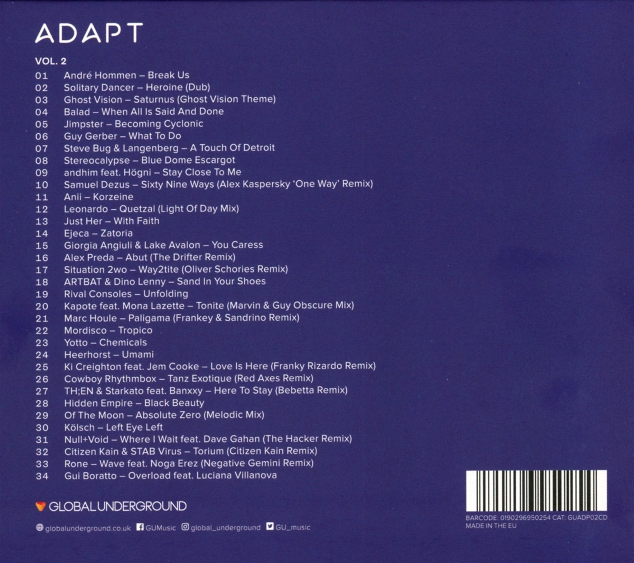 Das Londoner Label Global Underground präsentiert mit der hier vorliegenden Compilation »Adapt#2« die Fortsetzung der neuen Konzeptreihe Adapt: Eine Mischung aus bearbeiteten, überarbeiteten, angepassten und wiederverwerteten Tracks von einigen der weltweit führenden Elektro-Produzenten.