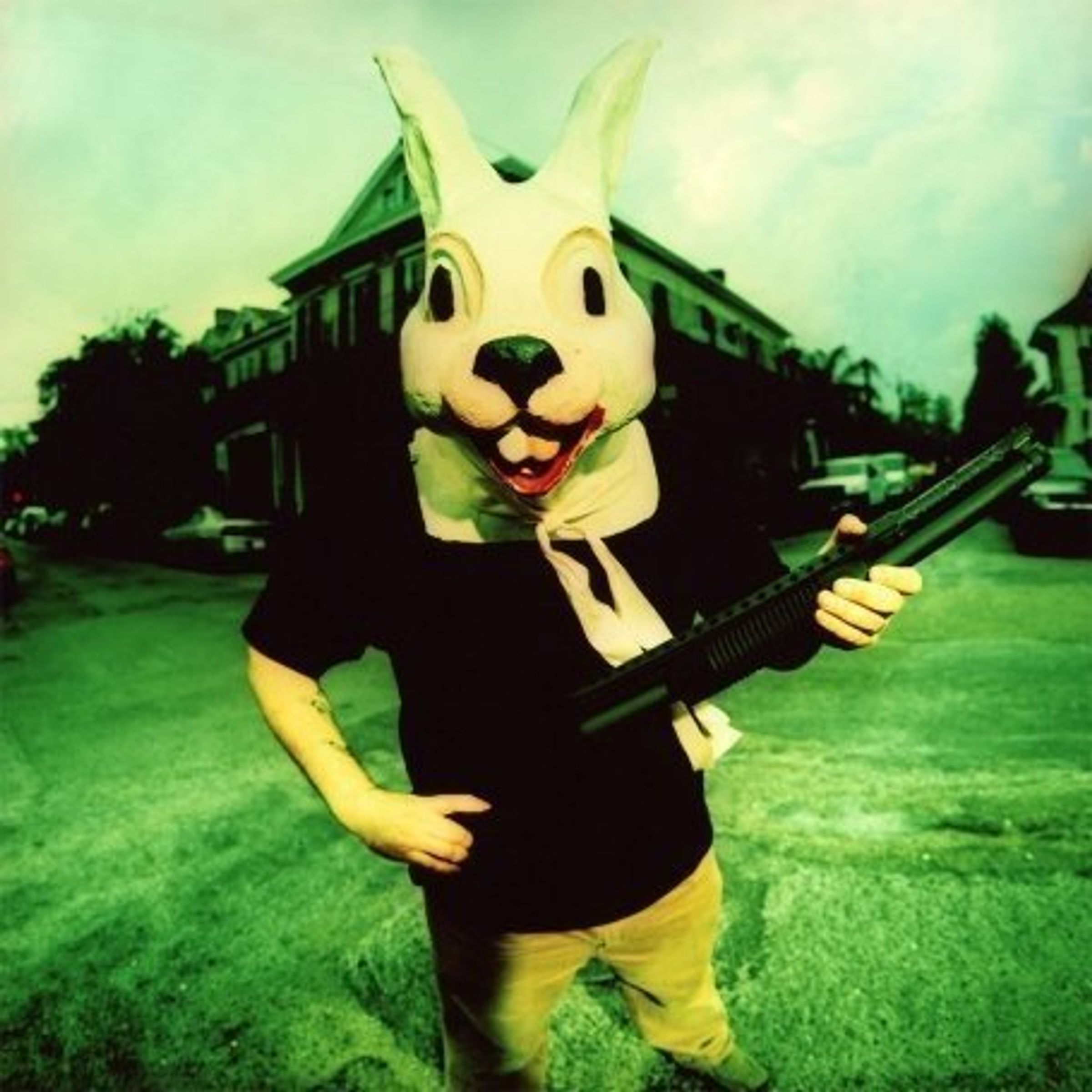 Eine Person in einem Hasenkostüm steht auf der Straße und hält ein Gewehr, im Hintergrund sind Häuser und Bäume., Single 12"